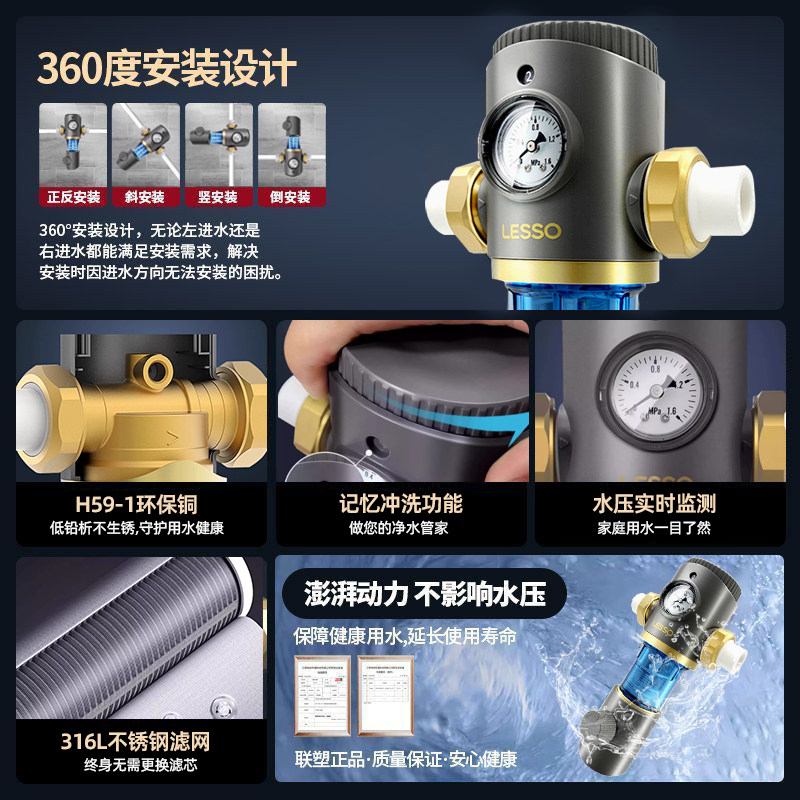 联塑LESSO前置过滤器家用全自动清洗净水器滤水反冲洗全铜防爆