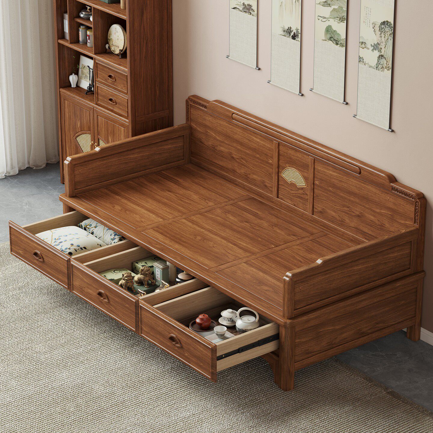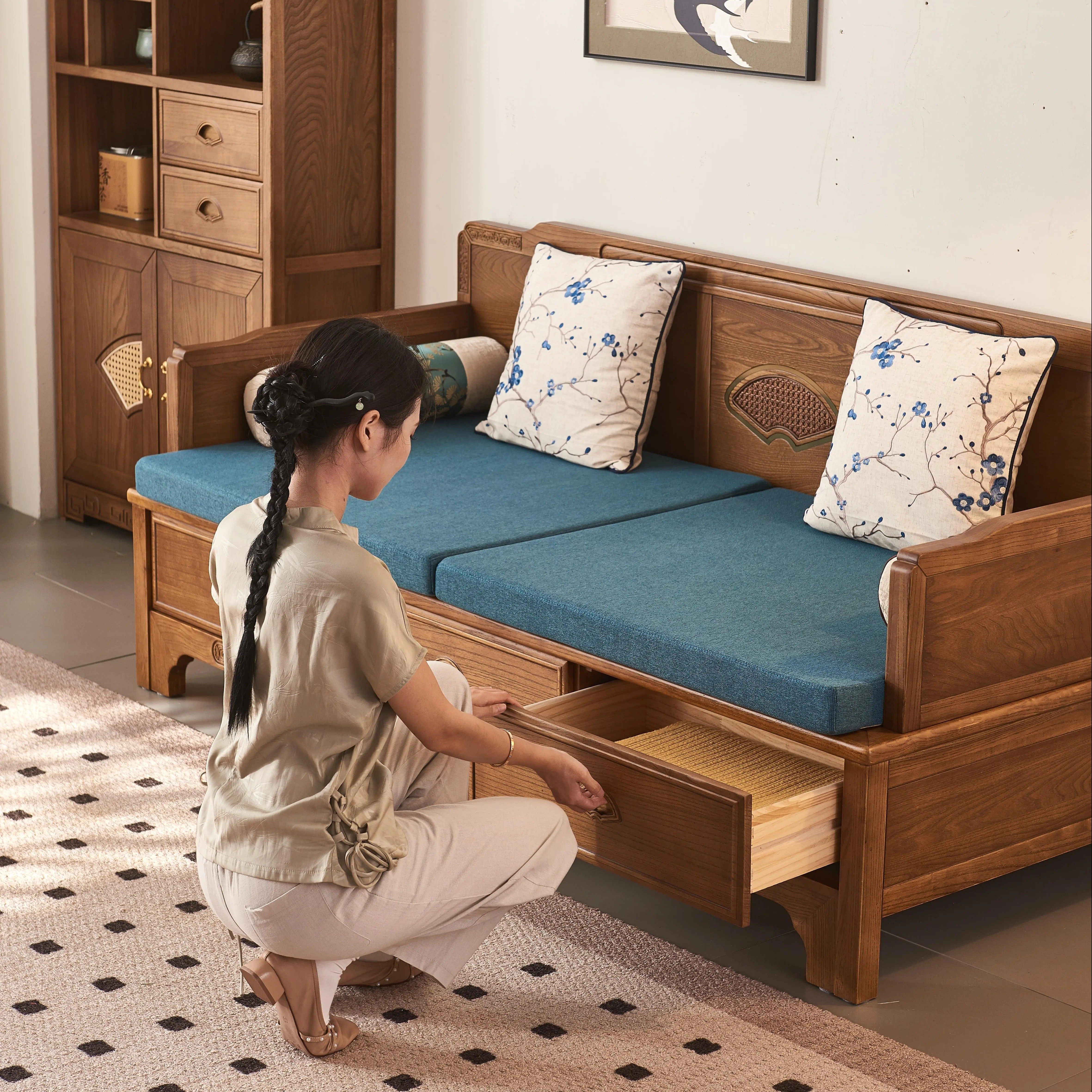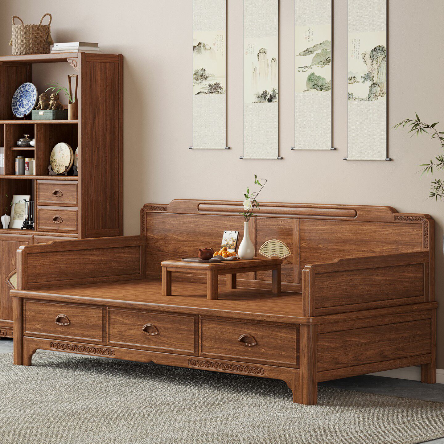政府补贴新中式实木推拉床老榆木客厅小户型多功能伸缩推拉罗汉床