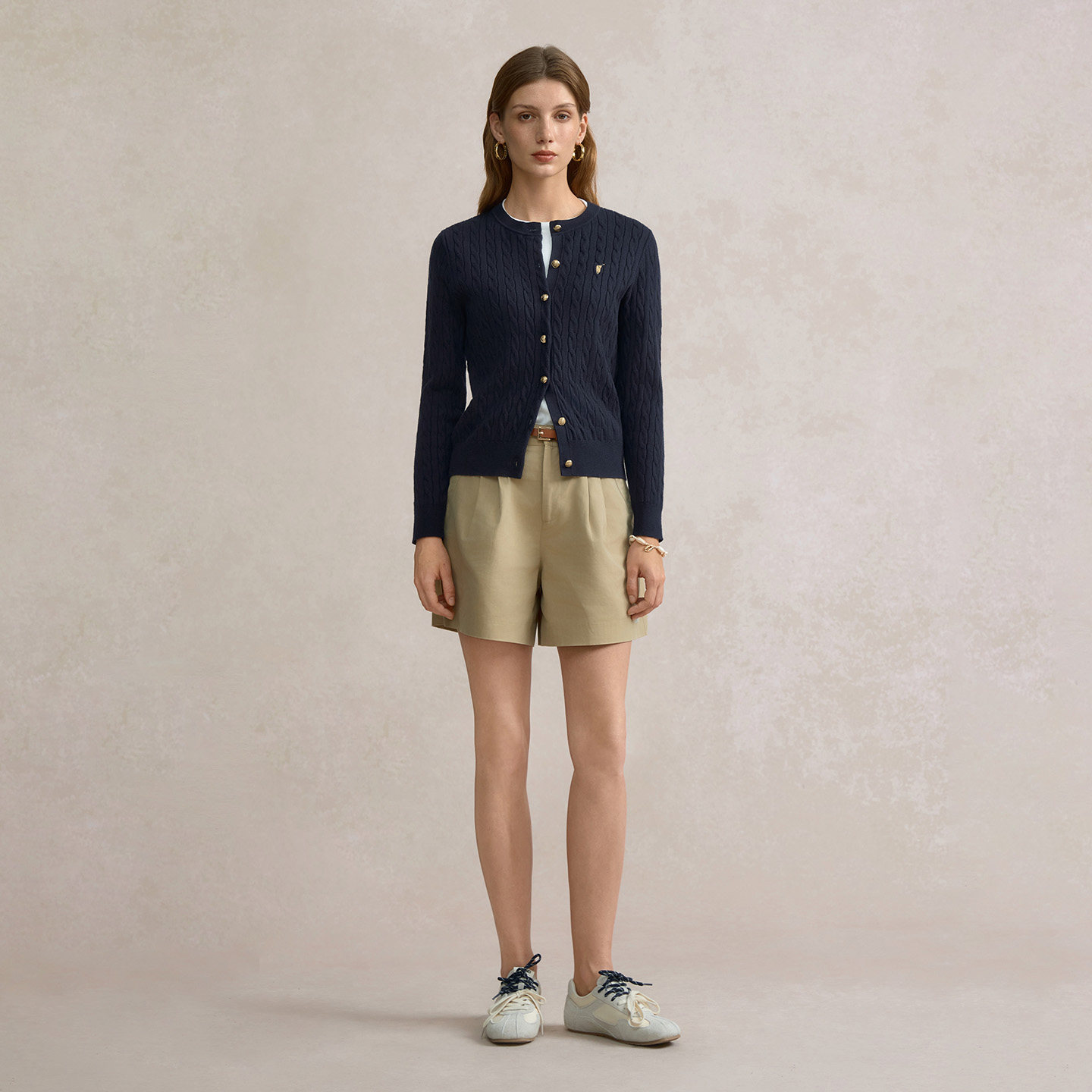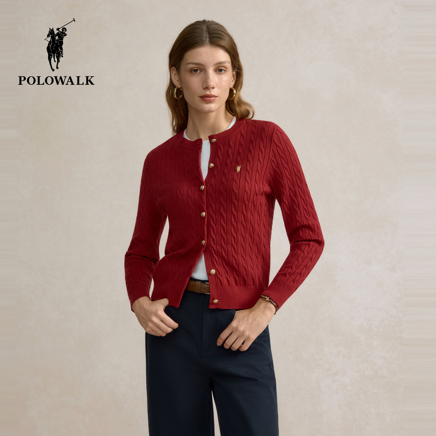 POLOWALK女士长袖针织衫2026春季绞花圆领开衫红色毛衣女上衣外套