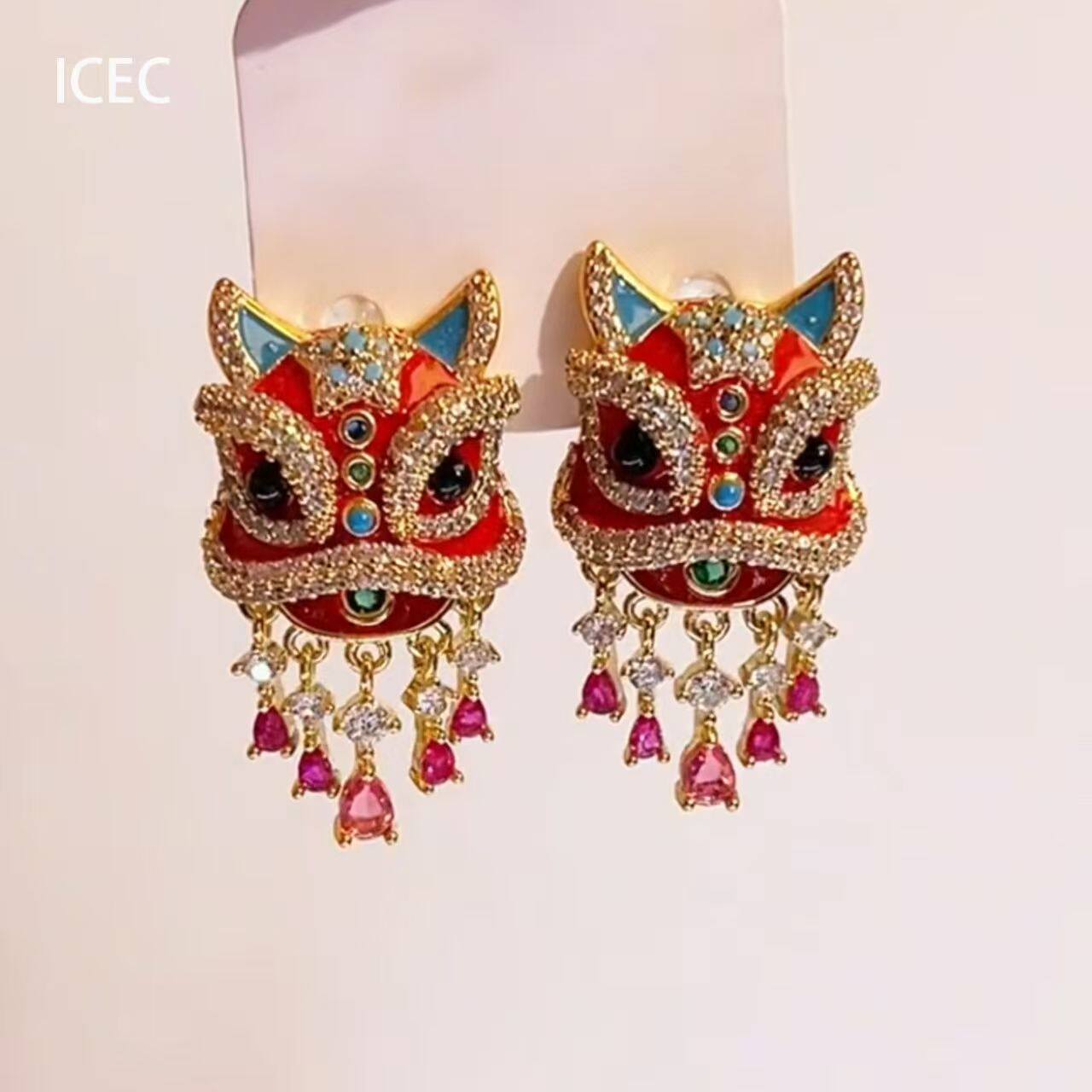 过年新中式爆闪满钻醒狮流苏耳钉国风气质轻奢重工新年感红色耳饰