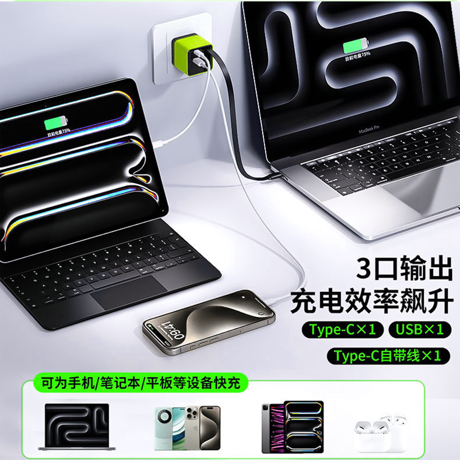3C认证80w氮化镓充电器闪充自带65cm伸缩数据线快充头适用华为苹果PD+USB接口全协议英规欧规超级快充充电头