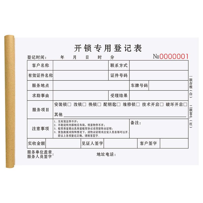 开锁登记本配汽车钥匙换锁记录表锁匠锁具指纹锁合同公司修锁收据