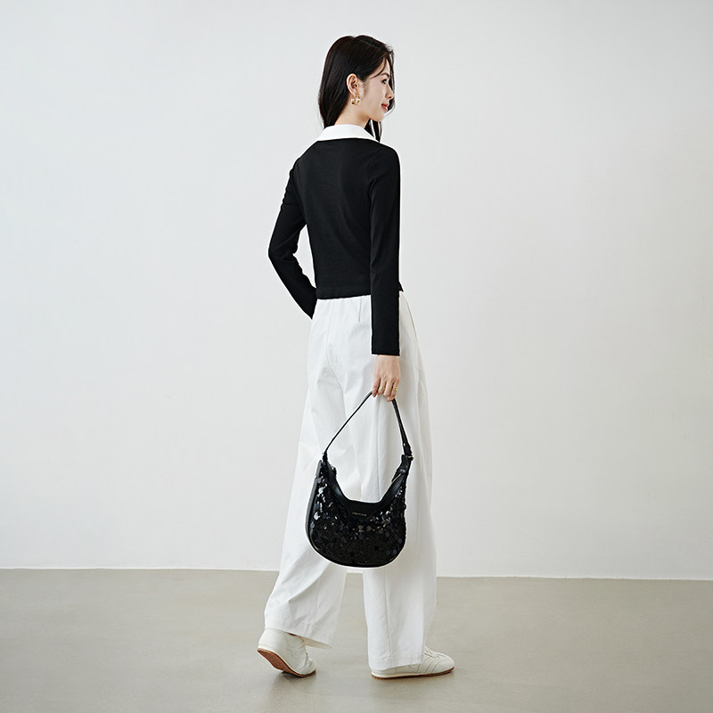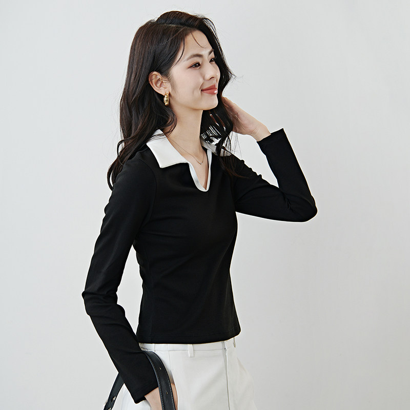 晚白2026年春新款黑白撞色上衣弹力修身小个子显瘦显高T恤衫女