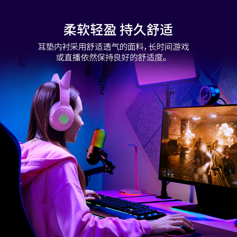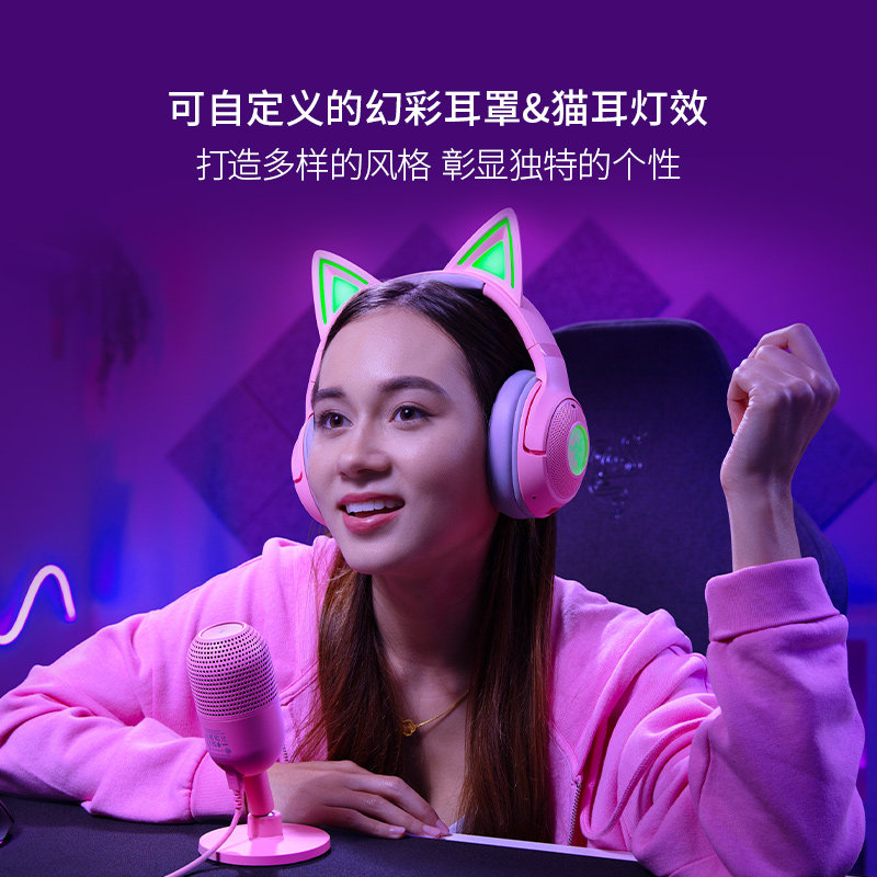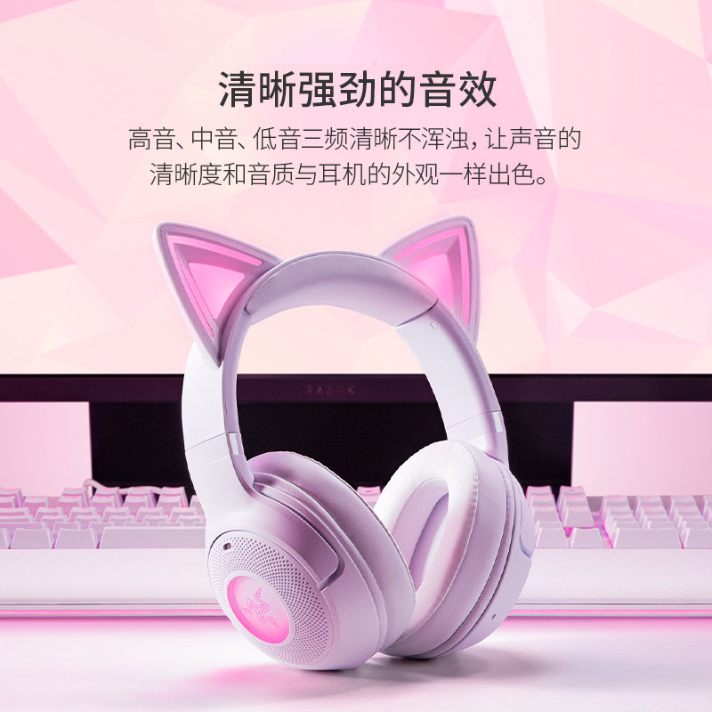 Razer雷蛇北海巨妖萌猫版V2粉晶白色BT头戴式电脑蓝牙无线耳机