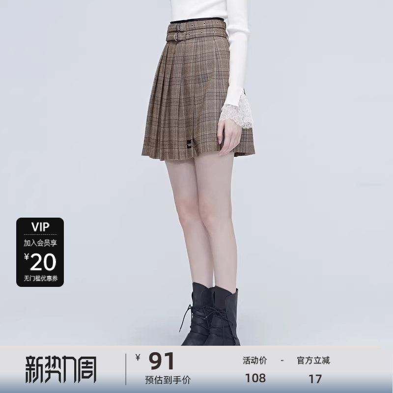 【秒杀】S·DEER圣迪奥秋通勤简约装撞色格纹压褶短裙S20381306
