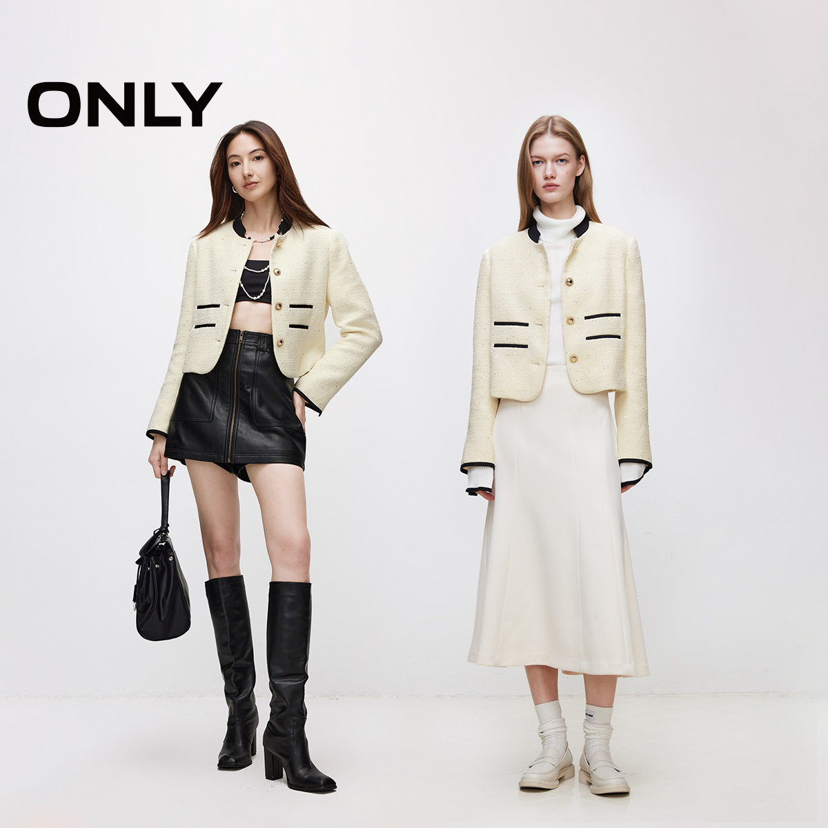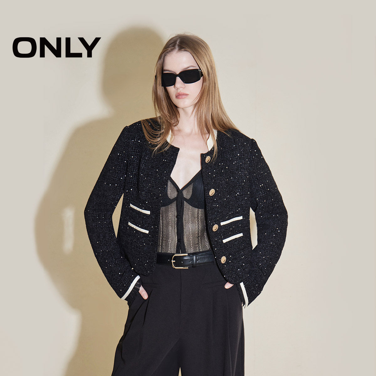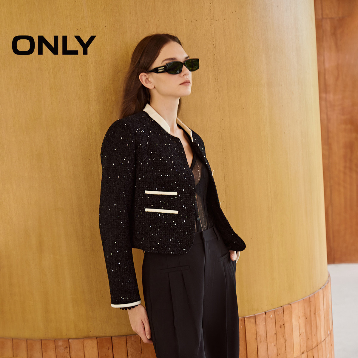 【ONLY奥莱】春夏新款气质立领撞色亮片小香风短款外套女