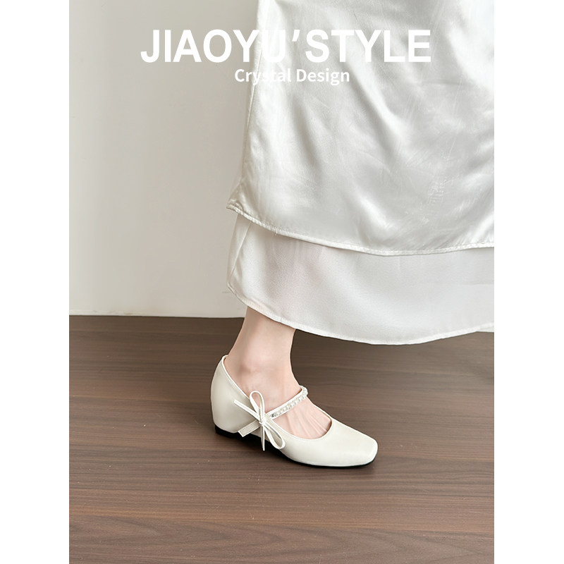 真皮~骄屿法式气质方头玛丽珍鞋高跟鞋仙女风珍珠蝴蝶结浅口单鞋