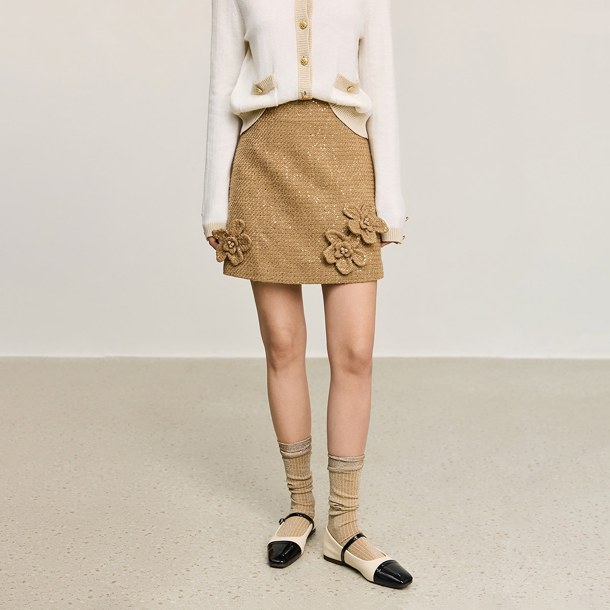 【商场同款】LILY冬新款女装新中式氛围感金色花纱半身裙短裙