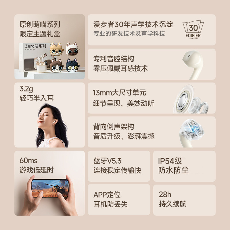 漫步者Zero喵真无线蓝牙耳机女士游戏运动久戴不痛高音质新款花再