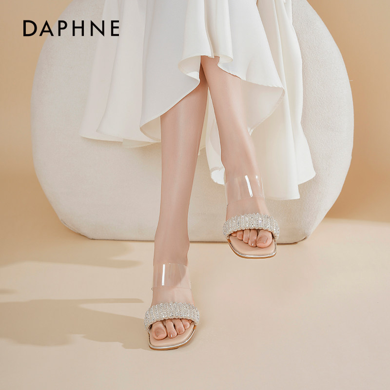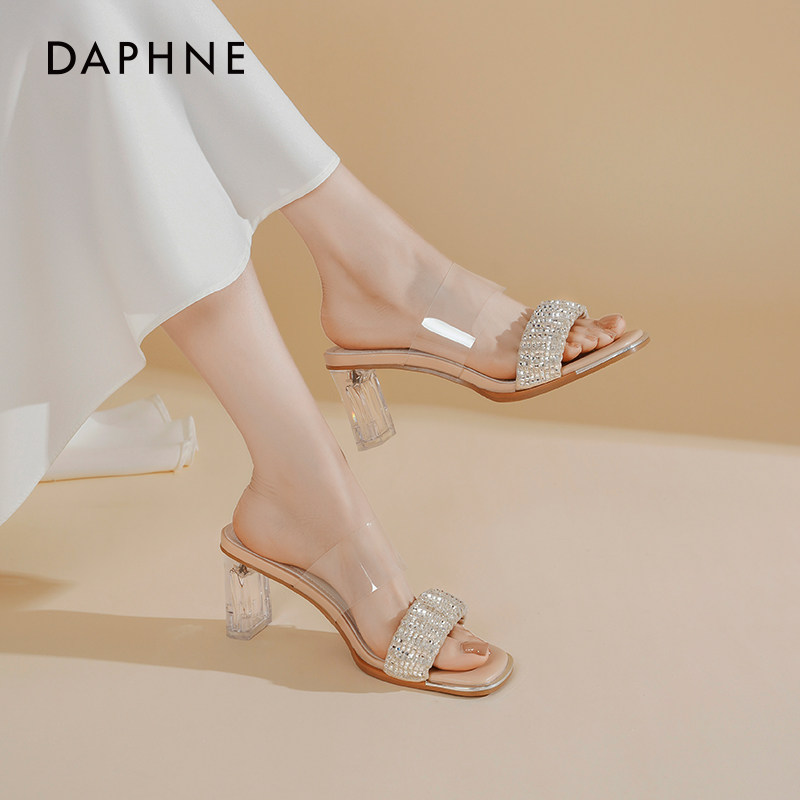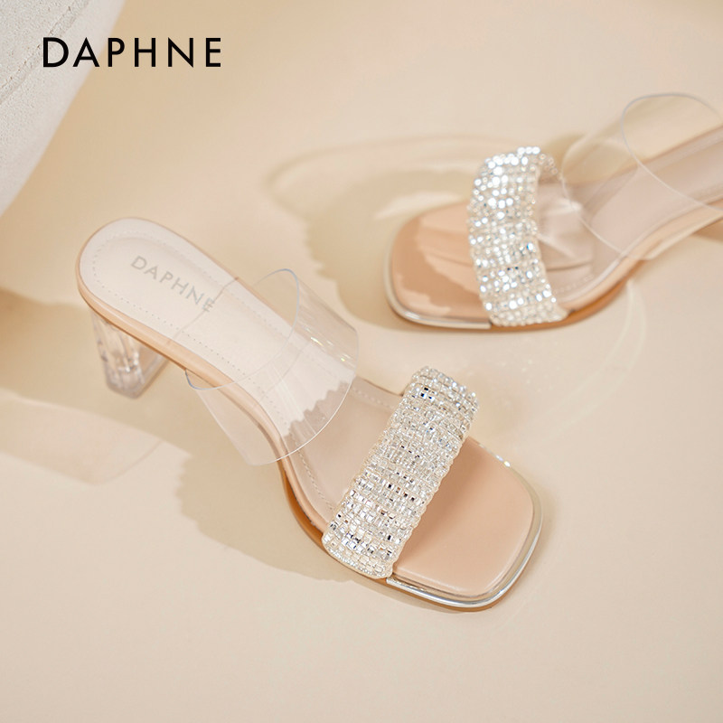 达芙妮透明高跟凉鞋女2025夏季新款水晶粗跟凉鞋一字带外穿拖鞋女