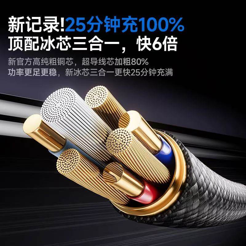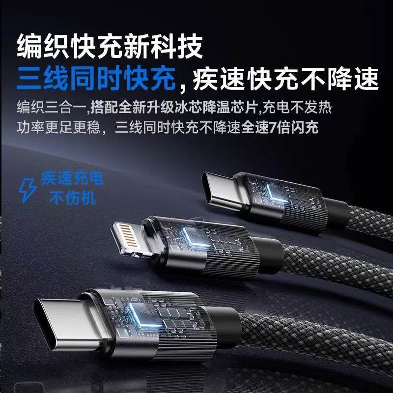 超级快充三合一数据线通用充电线适用苹果荣耀华为OPPO小米VIVO手机通用车载一拖三数据线透明芯片type-c带灯