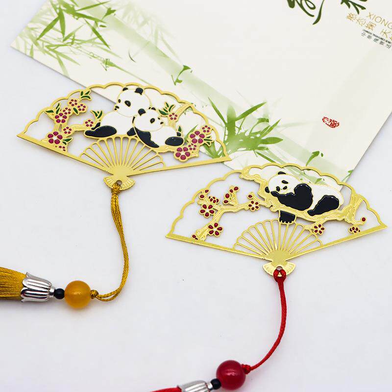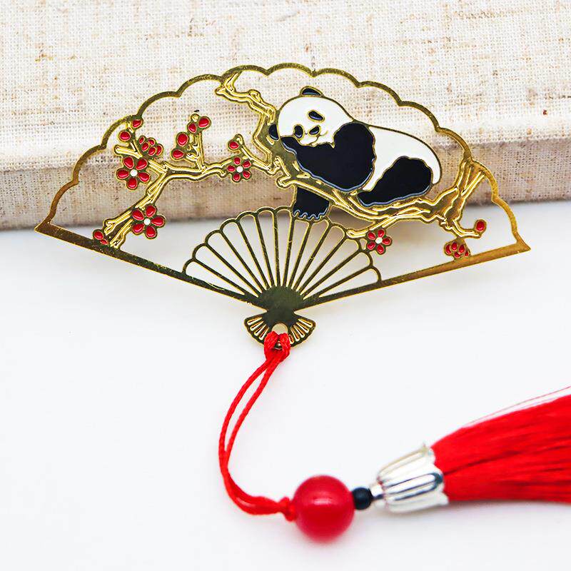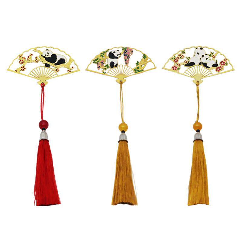 中式古风折扇书签可爱卡通熊猫书签金属镂空文创国潮流苏书签