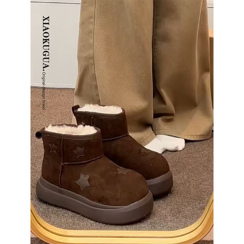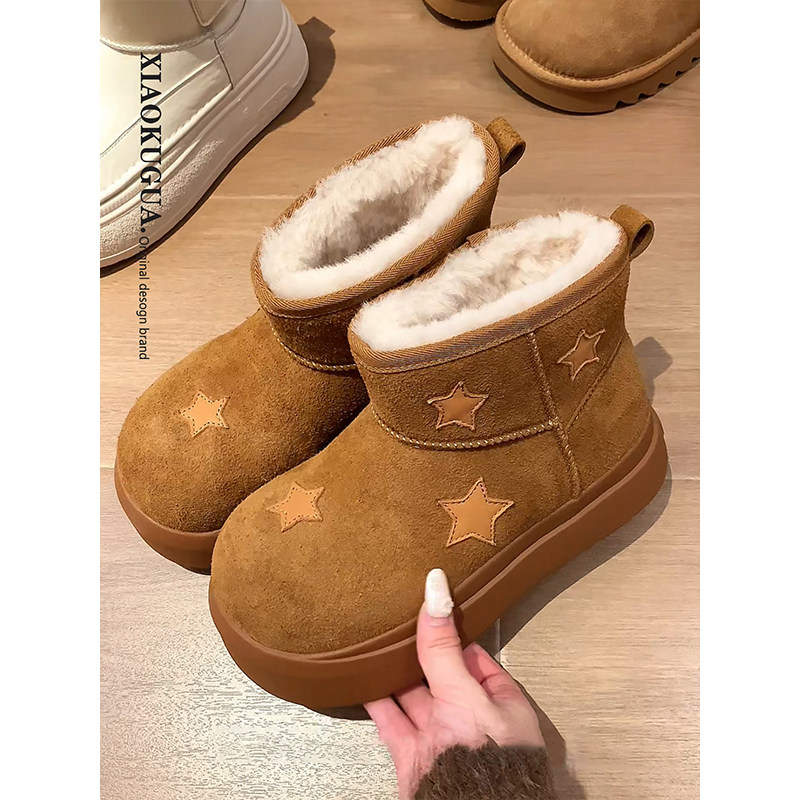 miu家厚底雪地靴女冬季真皮短靴羊毛侧拉链增高厚底加绒毛毛棉鞋