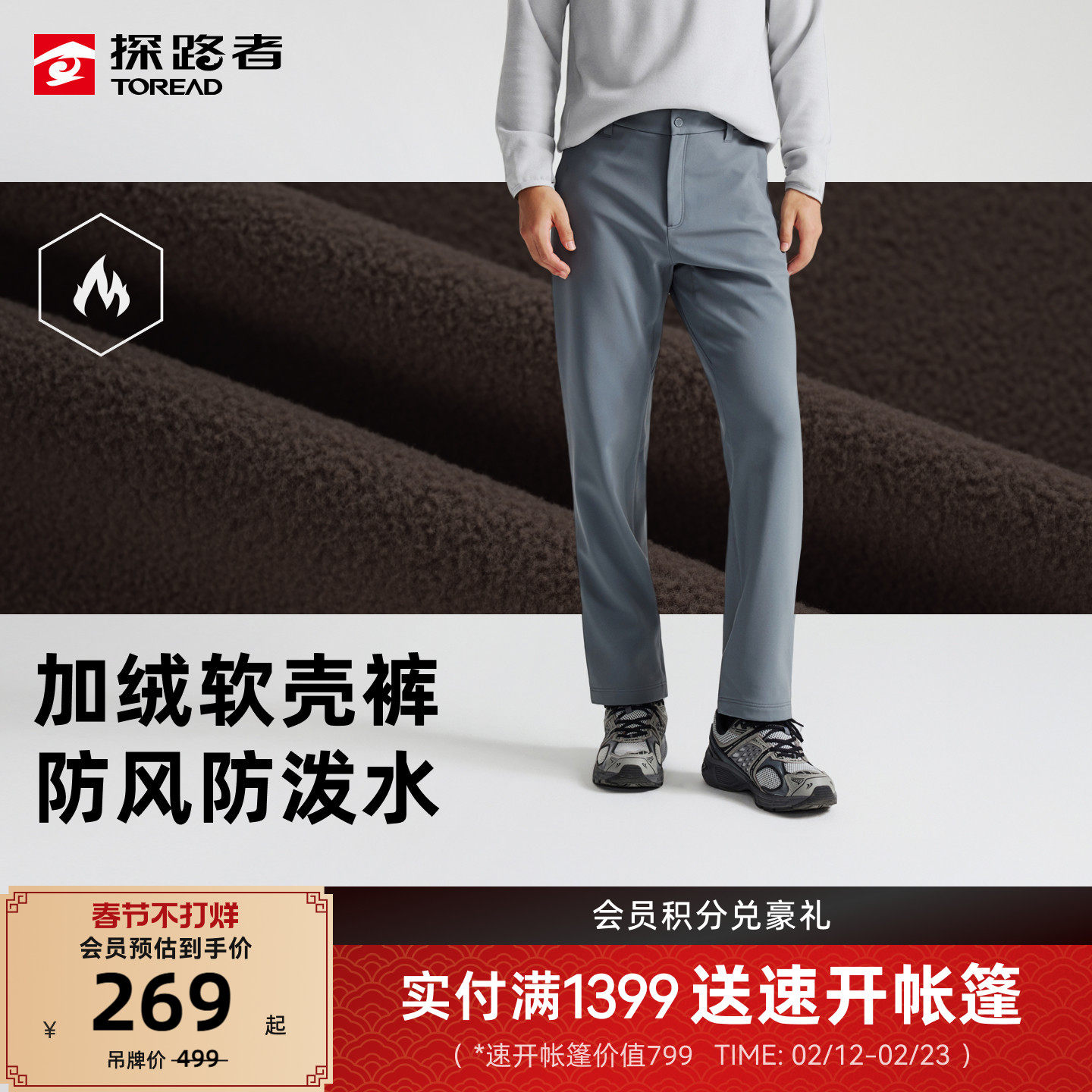 探路者软壳裤男2026新款户外运动防泼水防风徒步登山加绒休闲裤女