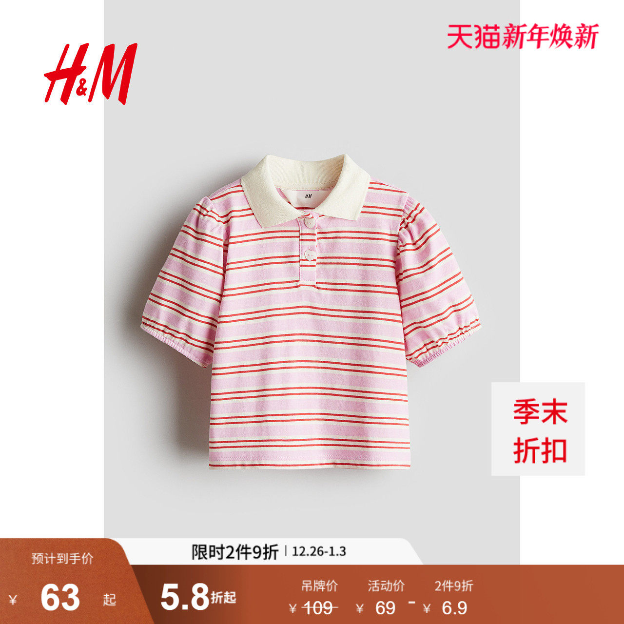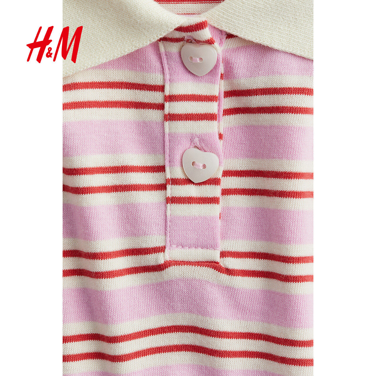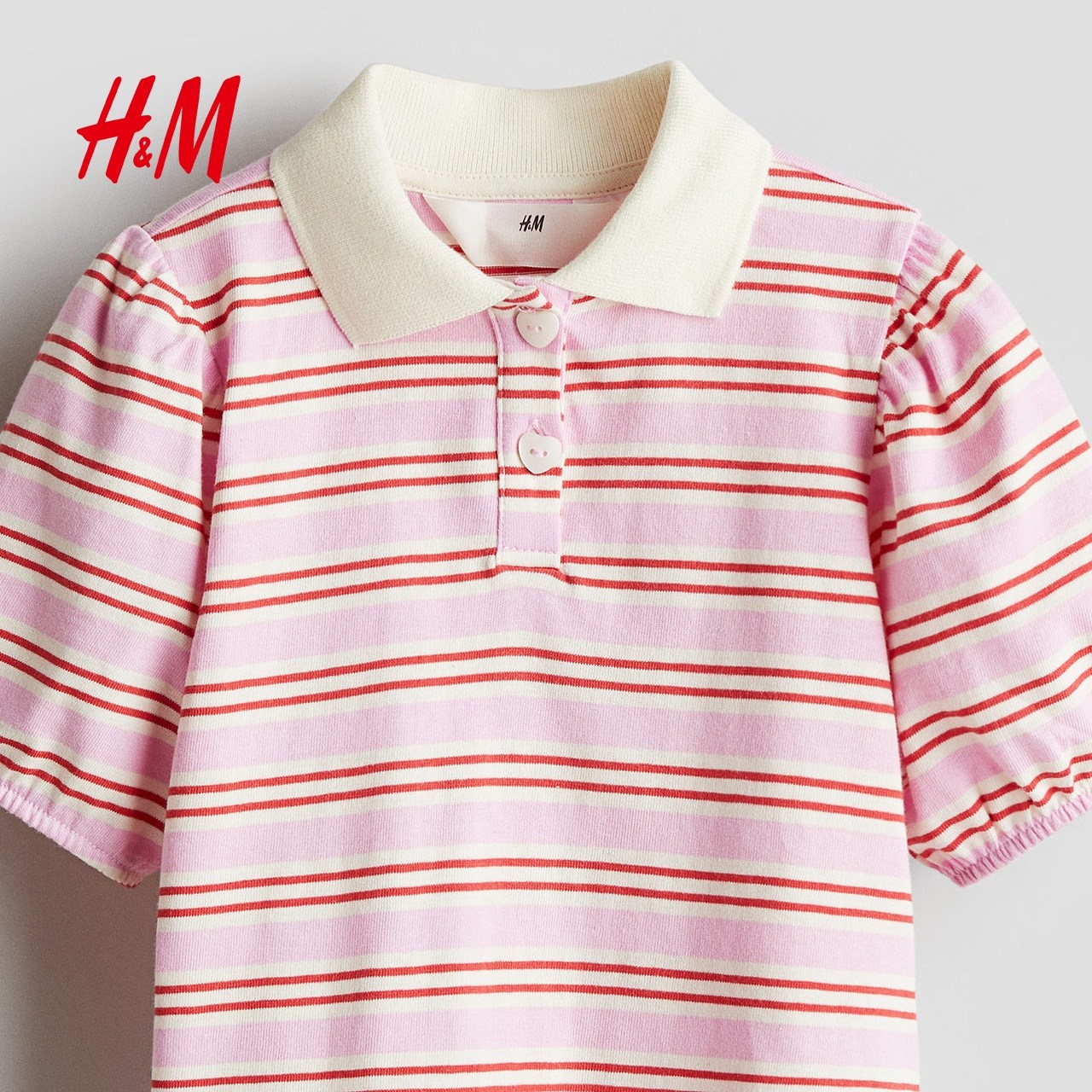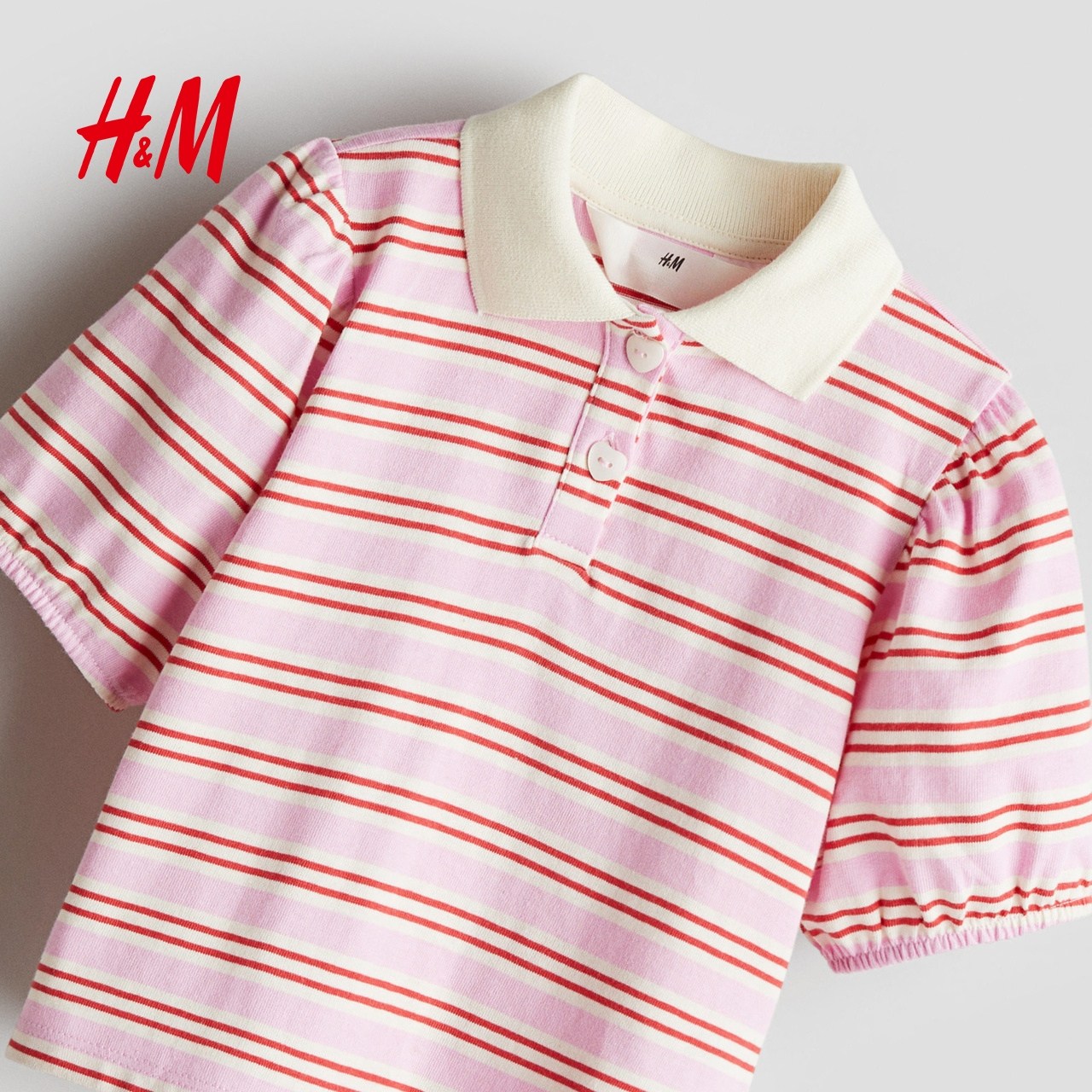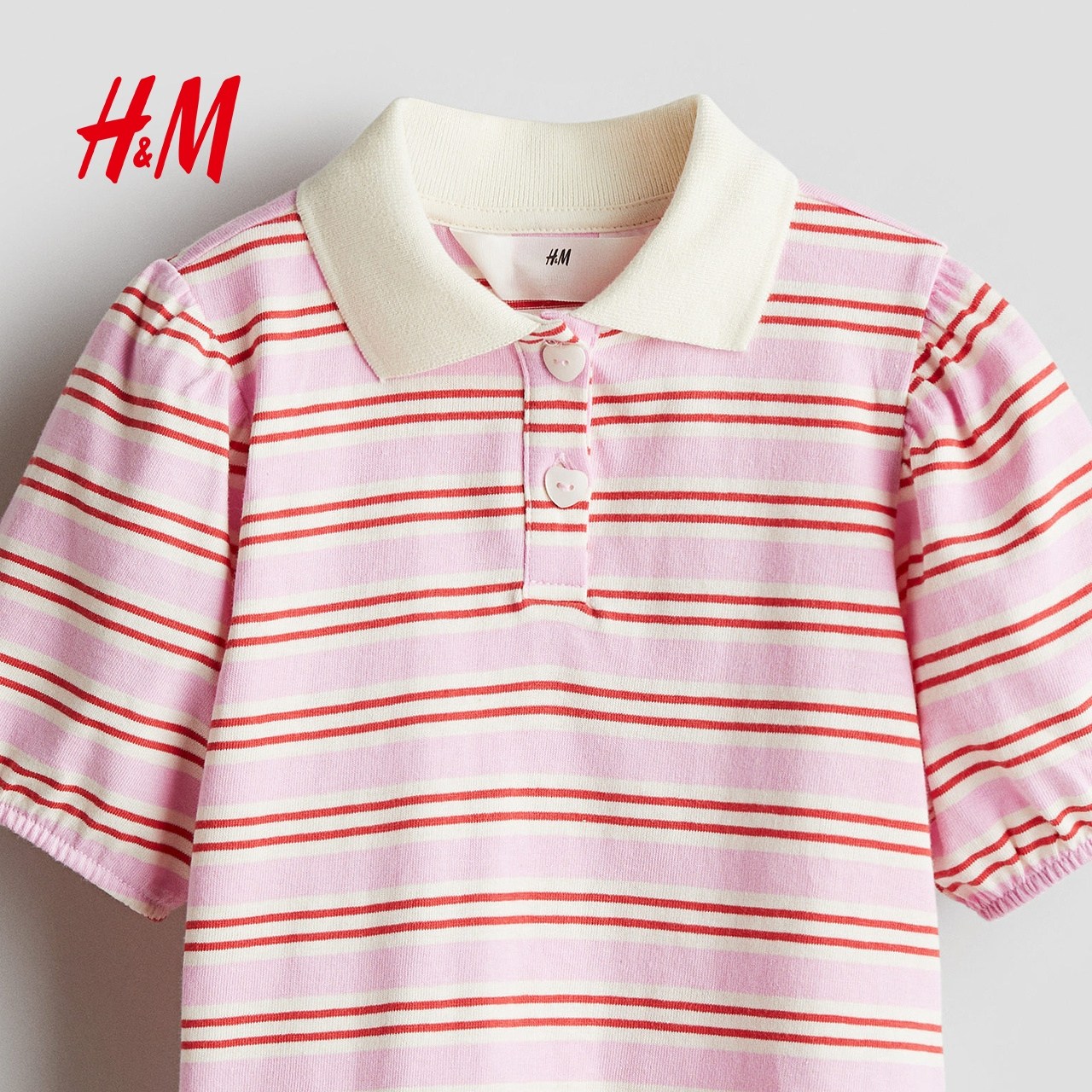 HM童装儿童女童POLO衫冬季柔软条纹翻领泡泡短袖上衣1261317