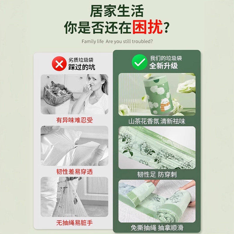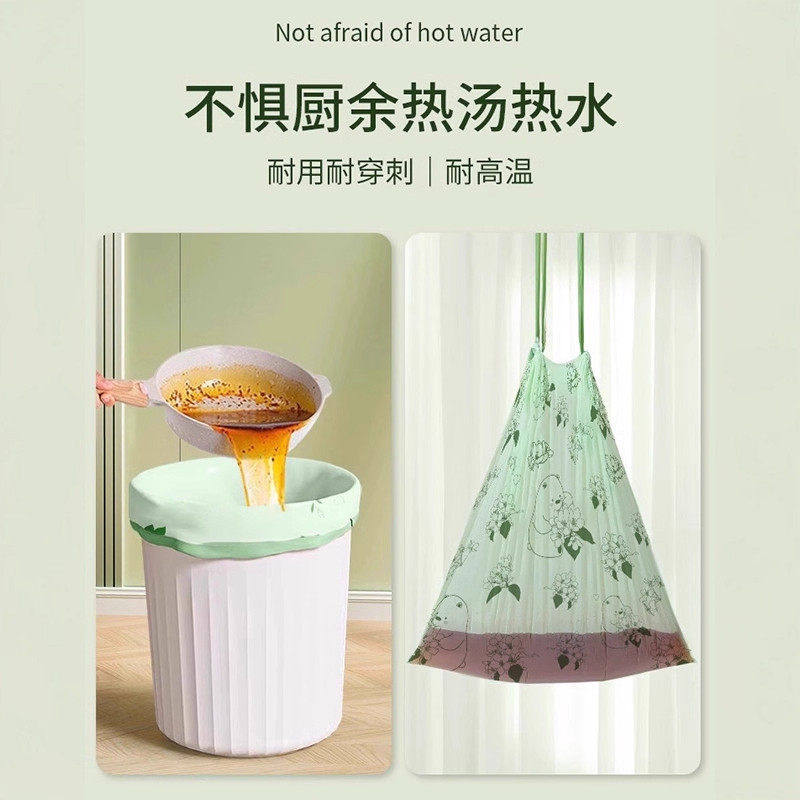 山茶花免撕垃圾袋加厚手提式家用大号抽绳厨房塑料袋耐用印花收口
