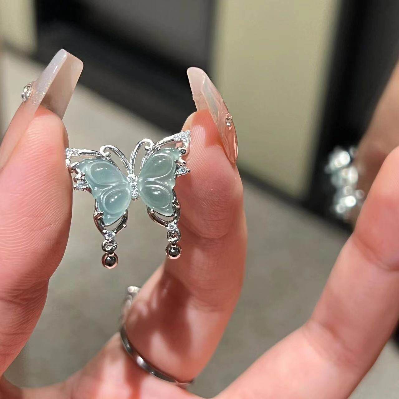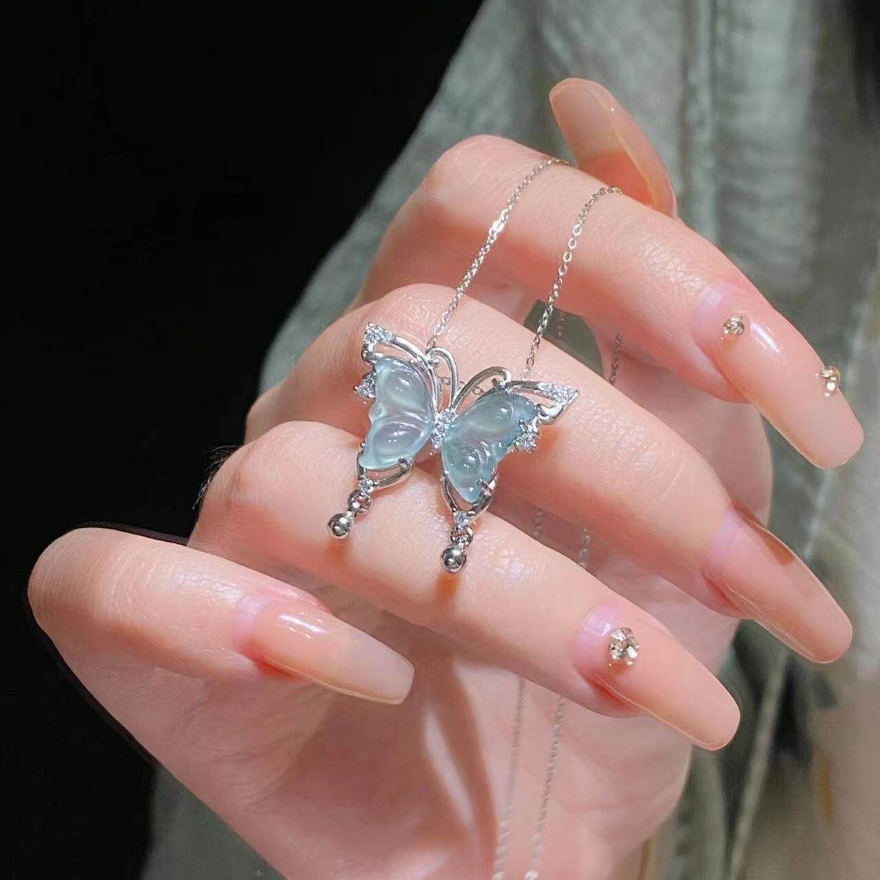oein中式危料蓝水翡翠蝴蝶锁骨项链冰种玉吊坠S925银天然转运
