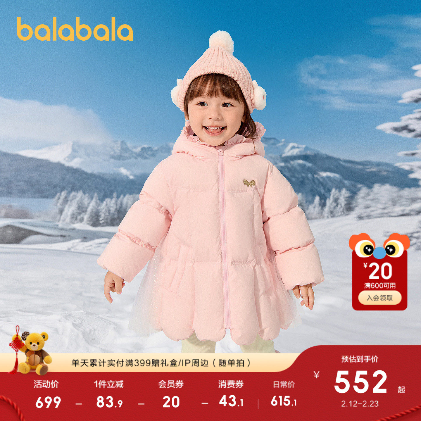 【商场同款】巴拉巴拉童装儿童羽绒服女宝宝冬装2025新款连帽外套