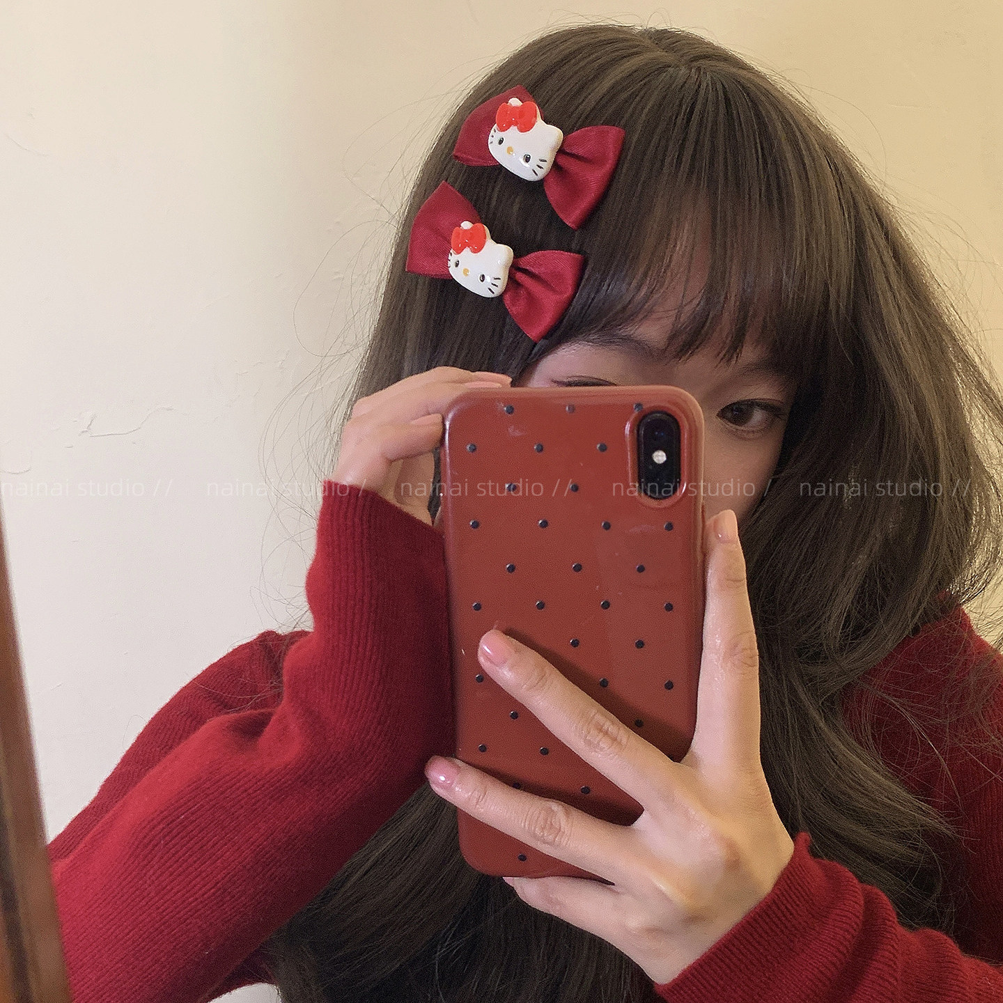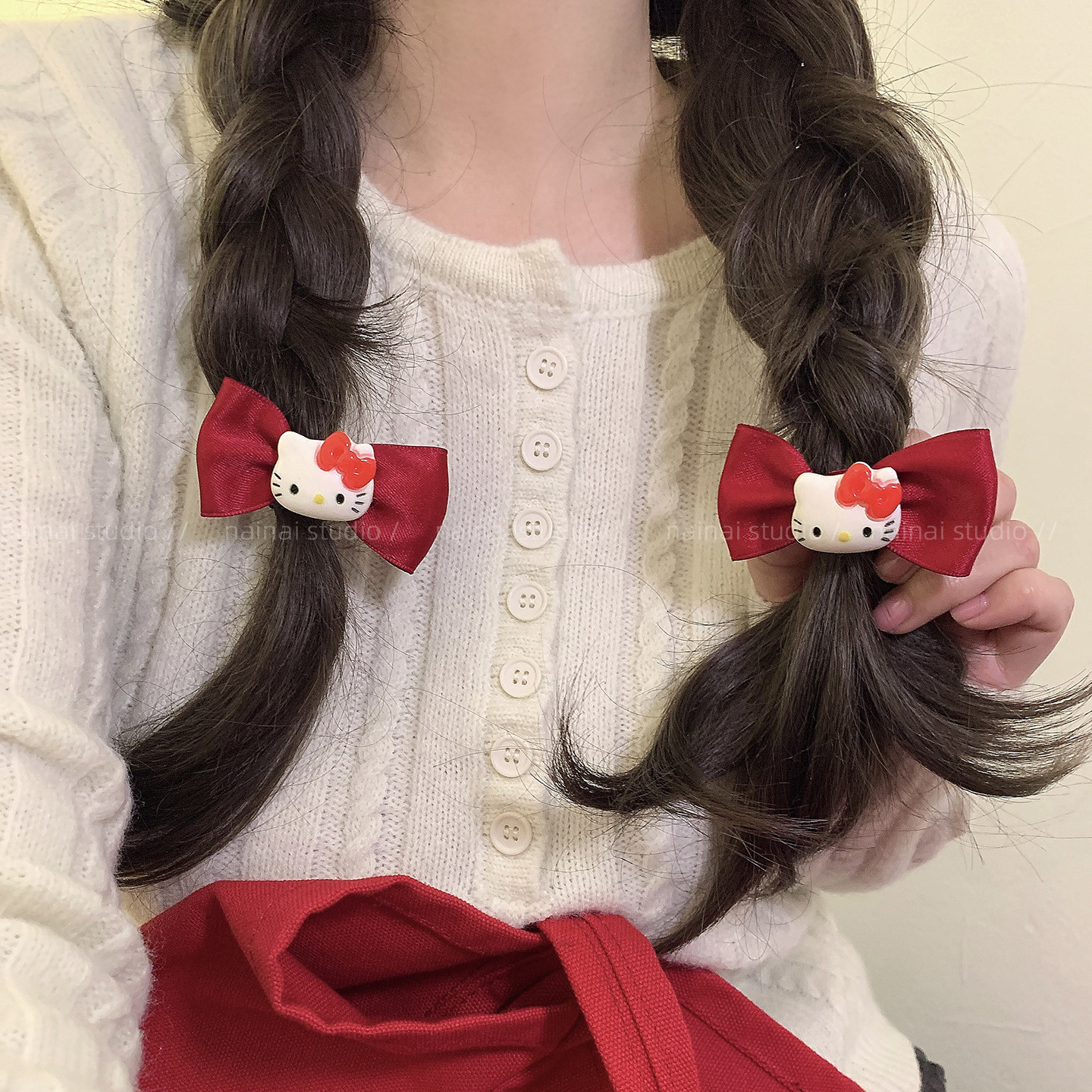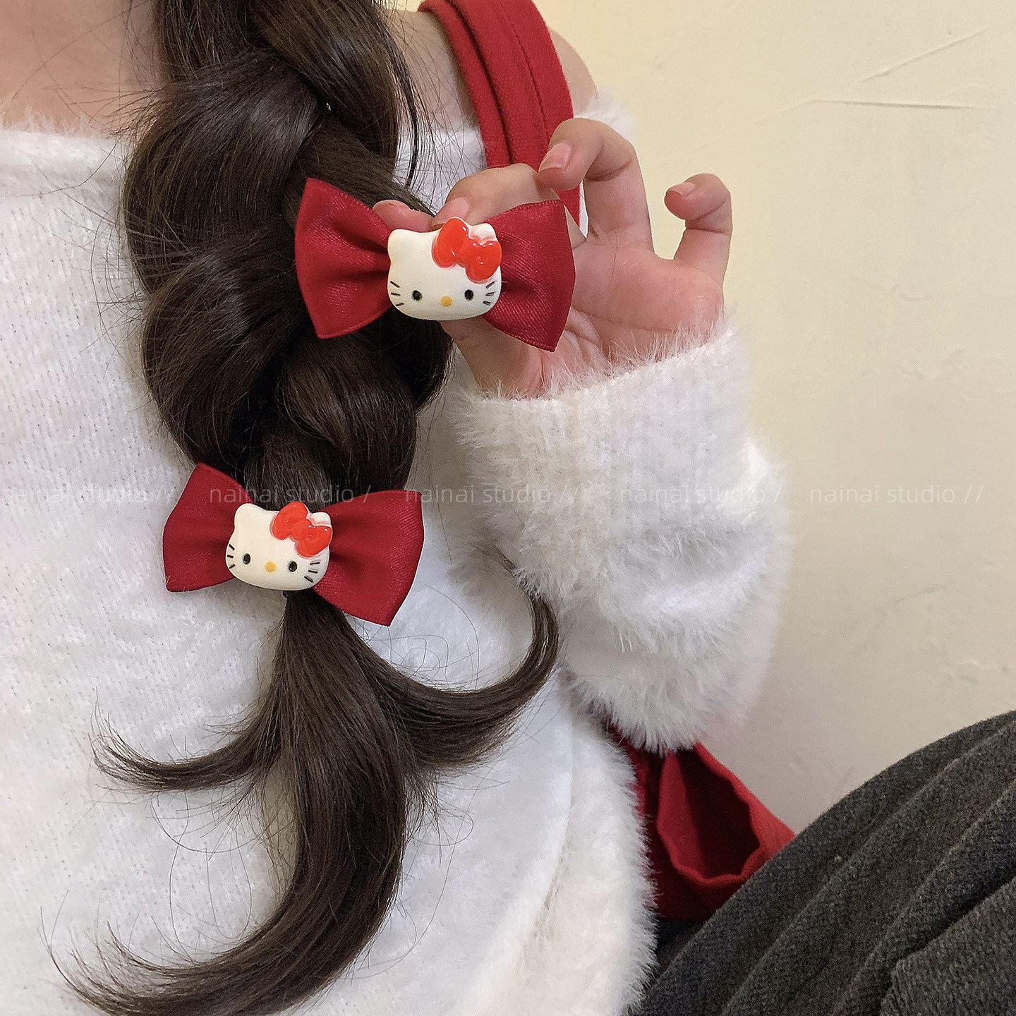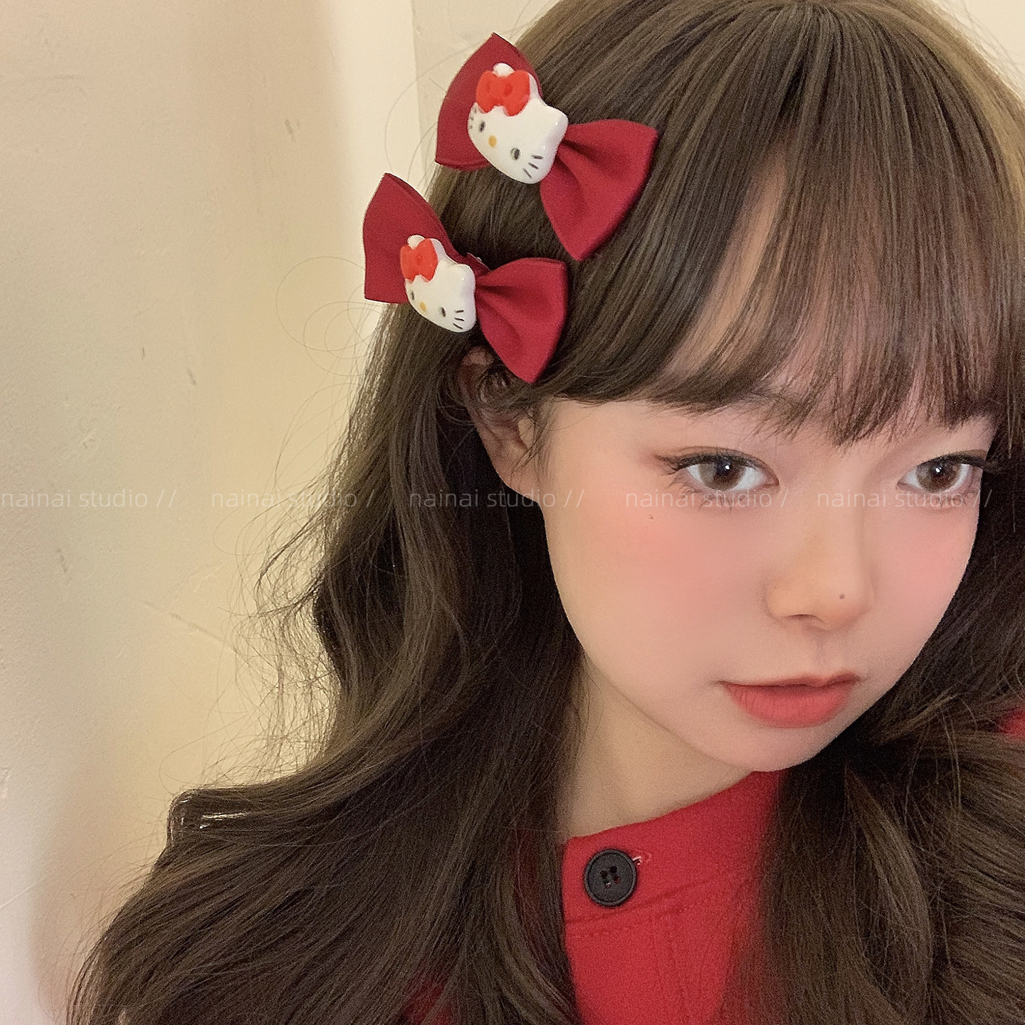 KT蝴蝶结发夹2只装~红色猫咪发圈侧边夹刘海夹可爱新年发饰头饰A