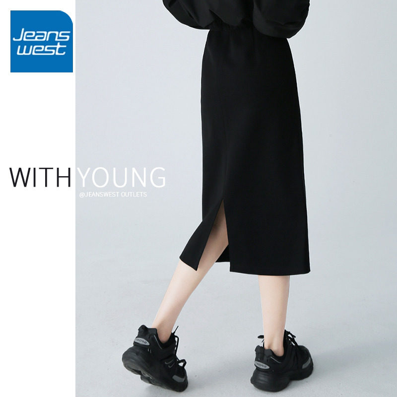 KCV真维斯黑色半身裙女春秋2025新款显瘦高腰后开叉修身显瘦裙子