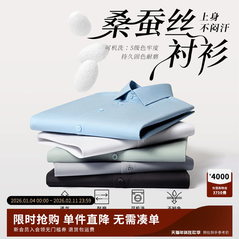[桑蚕丝]杉杉男士长袖衬衫2025秋季新款商务修身纯色白衬衣男款