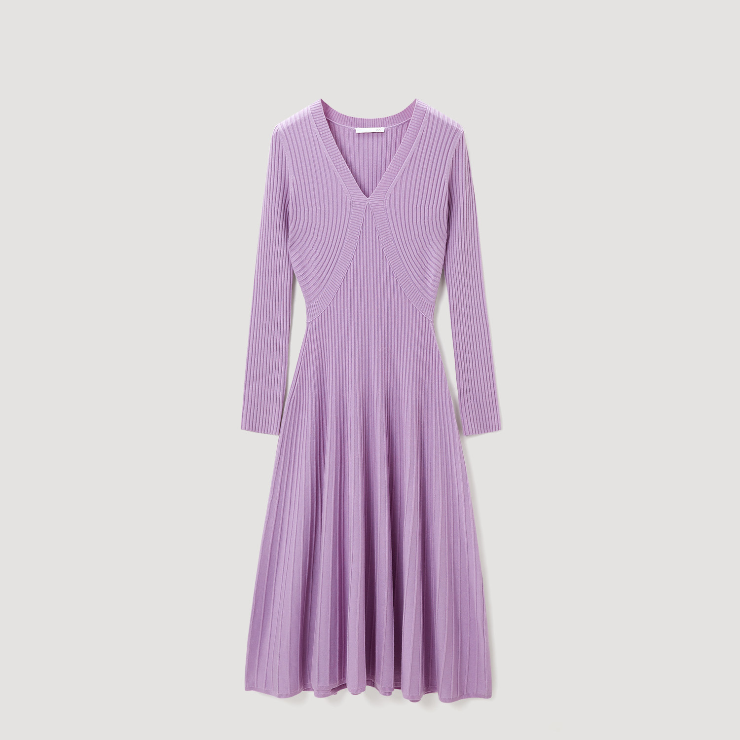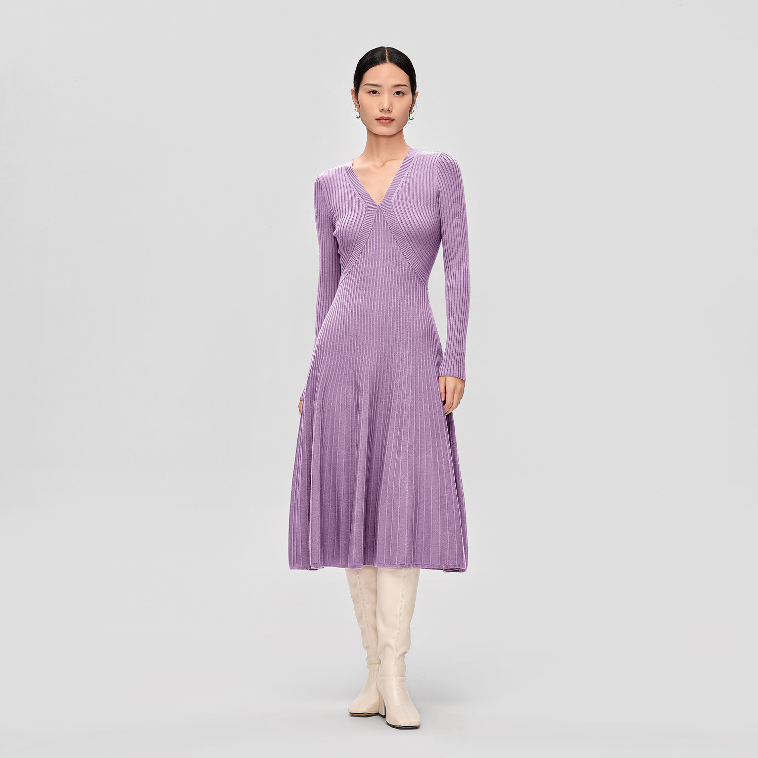 OVV秋冬新款女装舒适V领A字廓形下摆伞裙长袖针织连衣裙