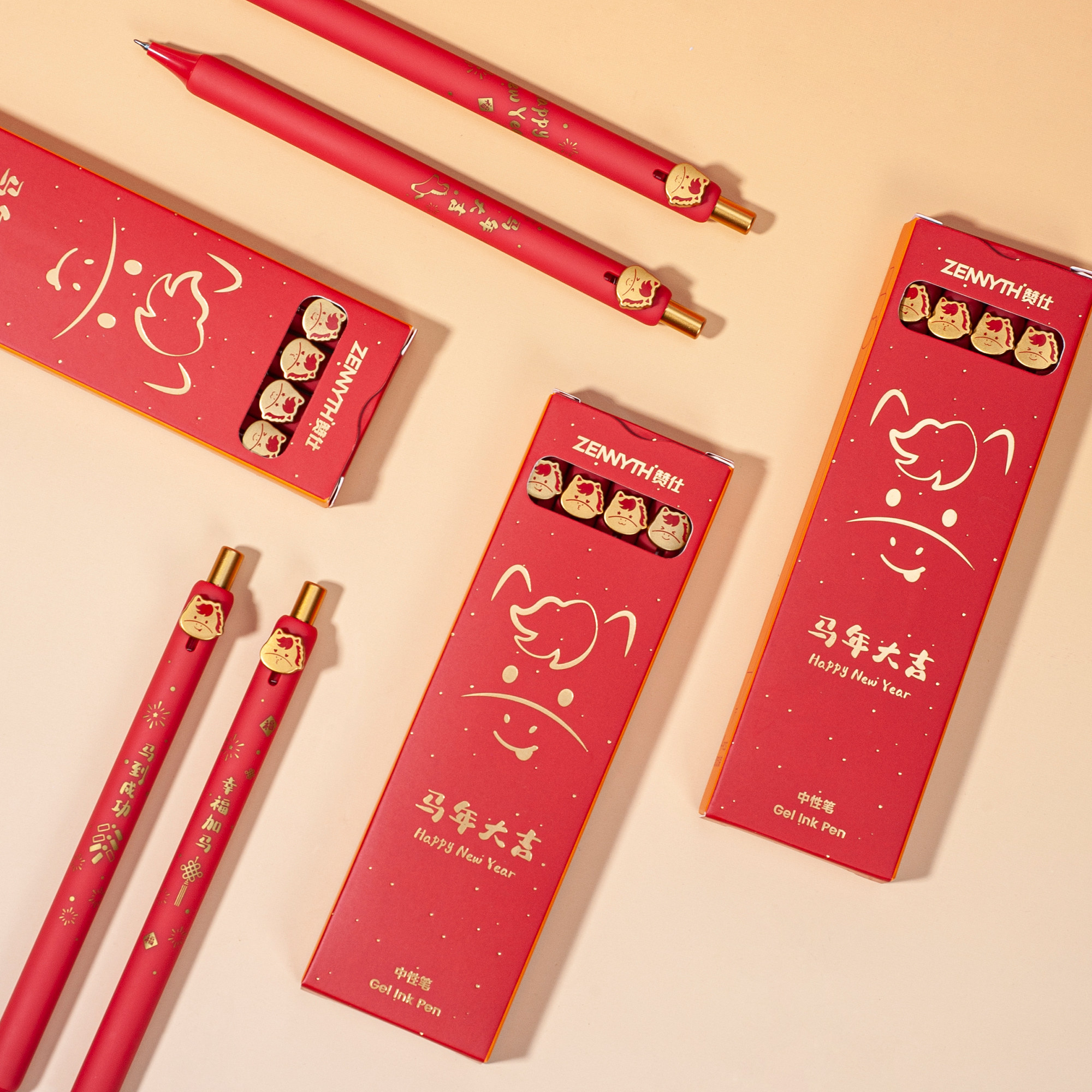 赞仕马年大吉中性笔贺岁限定款高颜值中国红按动纽扣笔0.5速干黑笔学生书写文具考试刷题笔新年礼物签字水笔