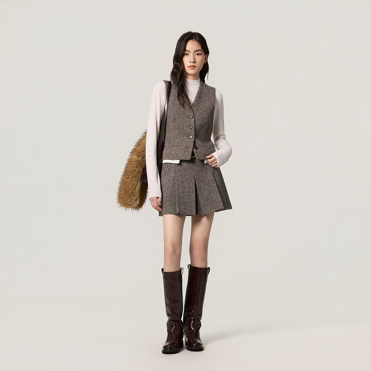 【热销补货】欧时力 羊毛双色呢V领马甲外套女背心后腰带冬