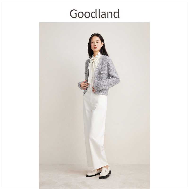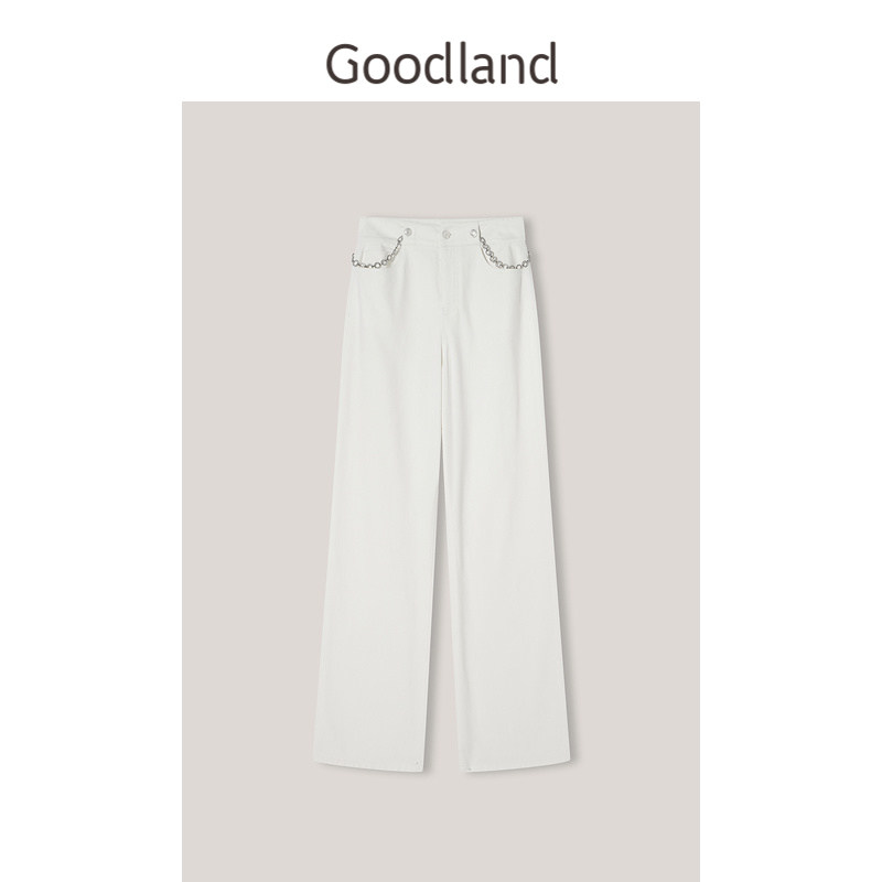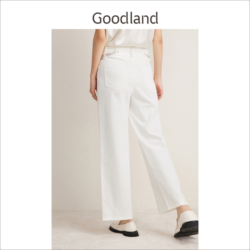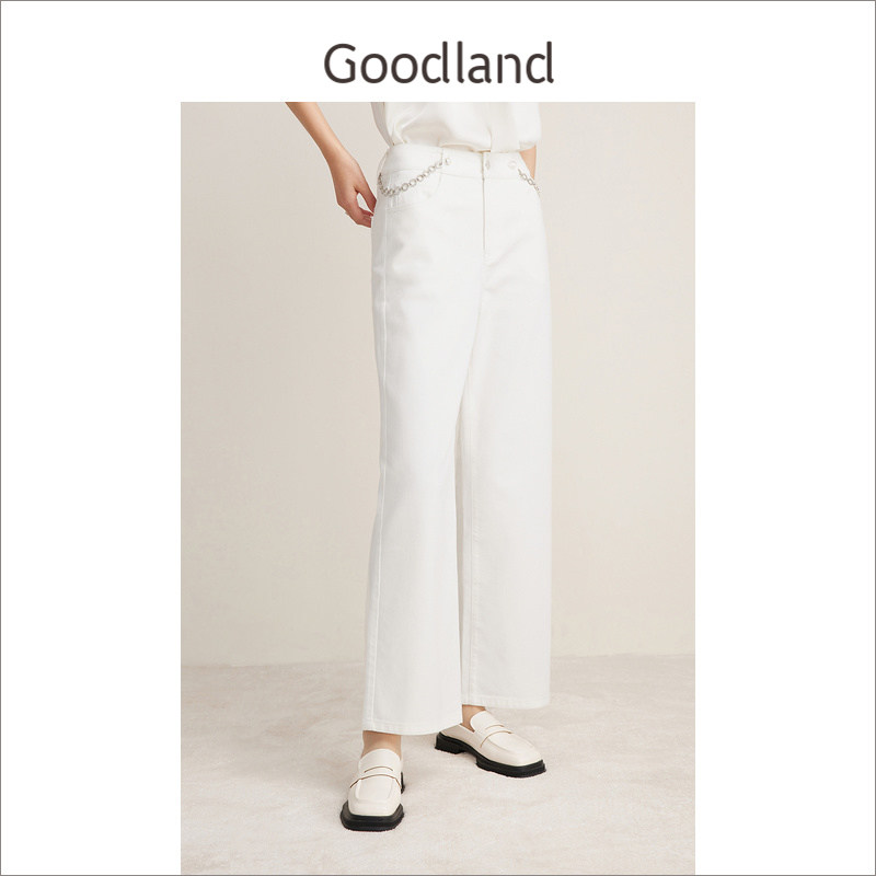 Goodland美地春季法式优雅腰链高腰长裤阔腿白色牛仔裤