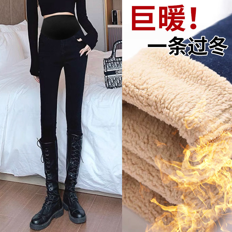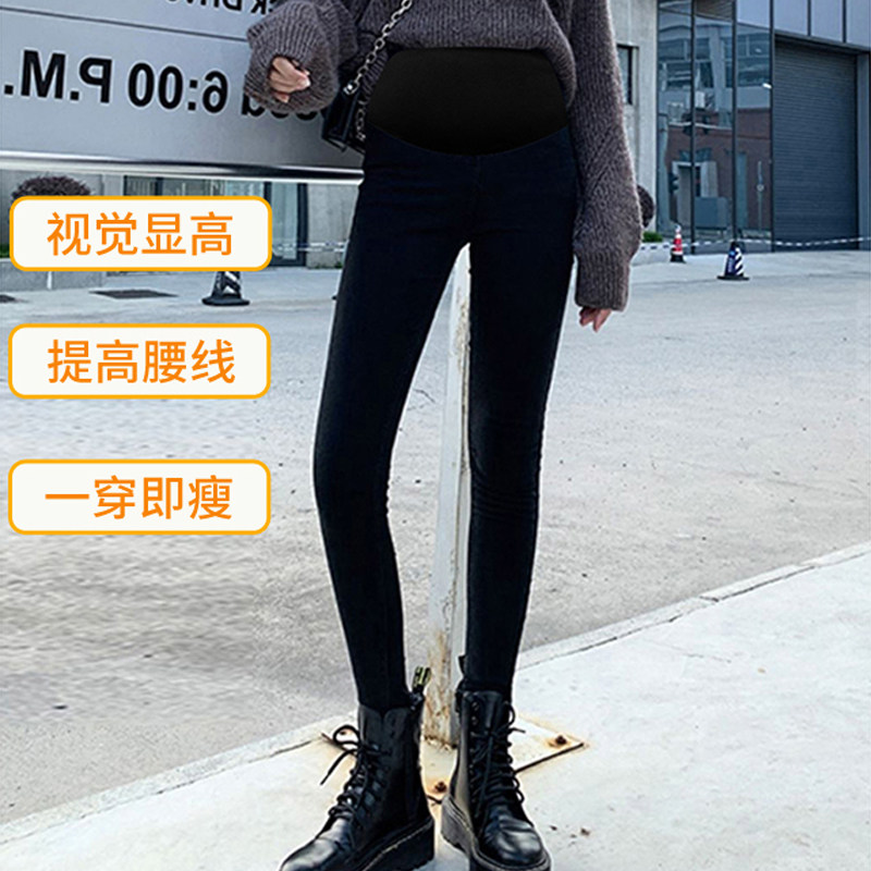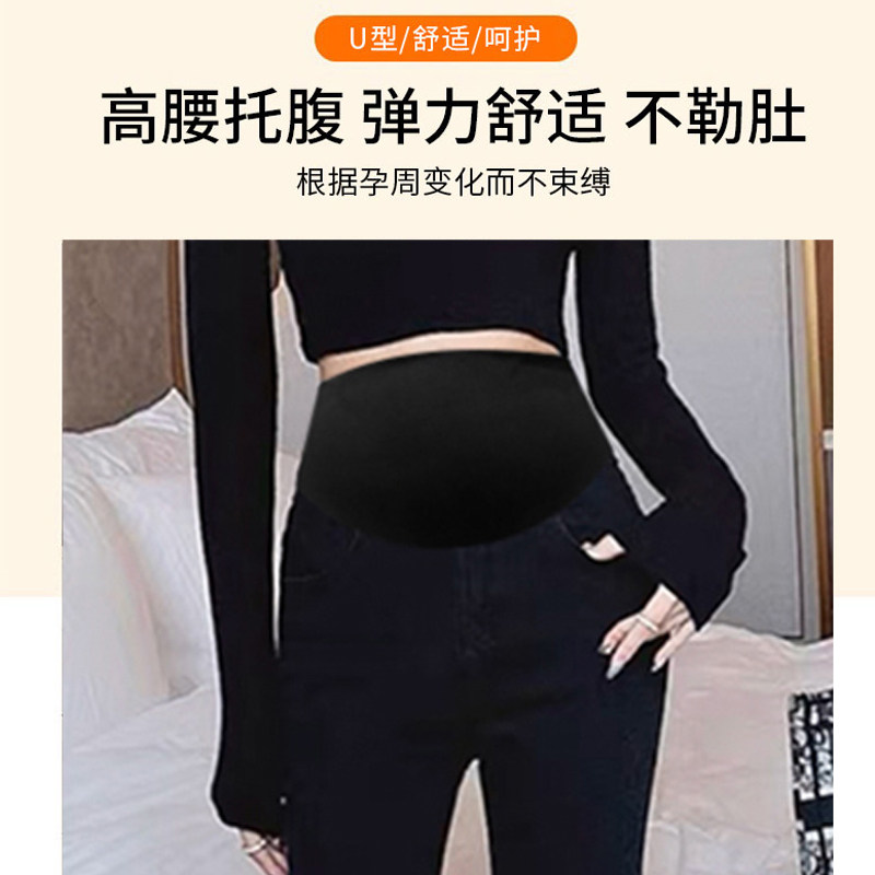 婧麒孕妇裤子秋冬款外穿加绒加厚小脚牛仔裤不勒肚子小黑裤孕妇装