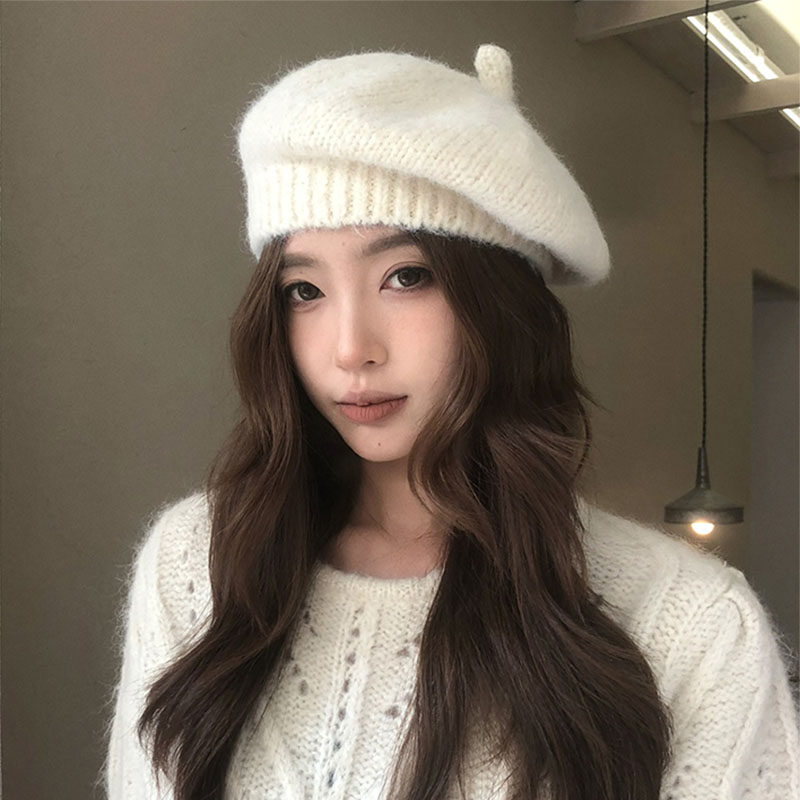 韩系氛围感针织帽子女冬季保暖贝雷帽马海毛画家帽红色灰色白色