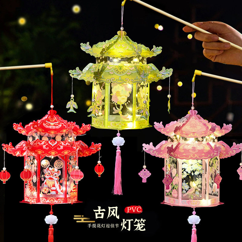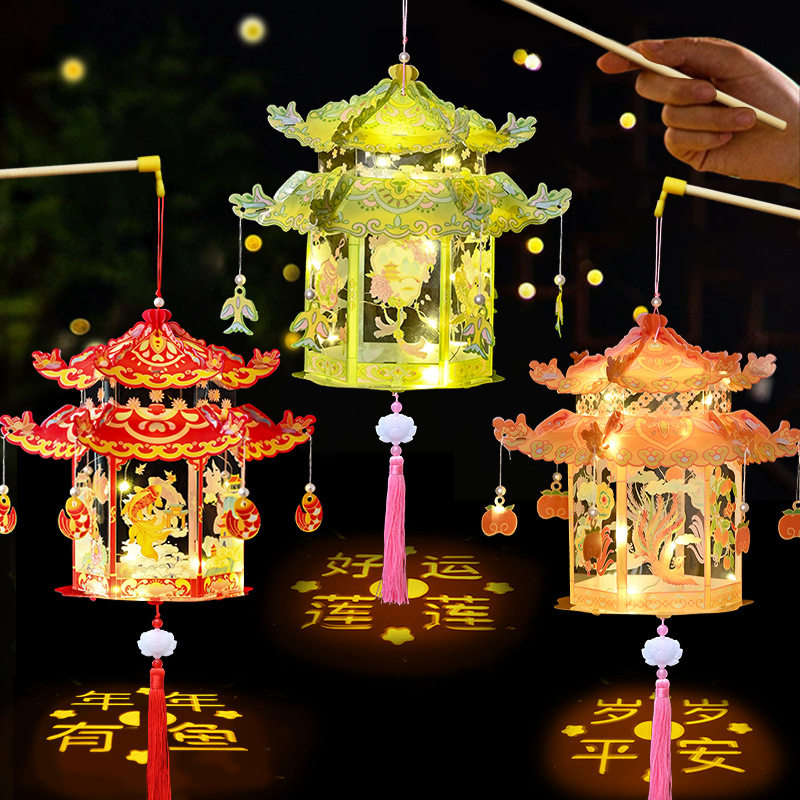 马年国潮古风灯笼手工diy花灯儿童手提宫灯发光投影新年幼儿园