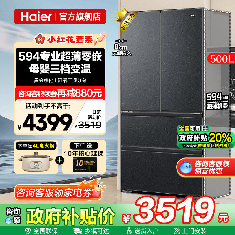 海尔500升法式超薄零嵌入式大容量一级能效无霜家用电冰箱旗舰店