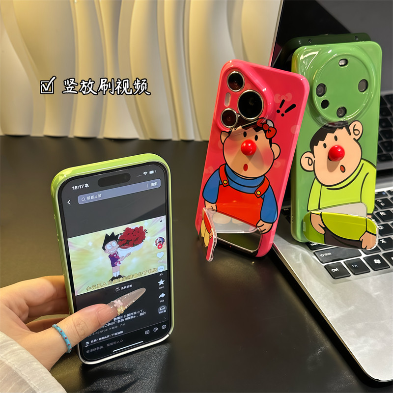 趣味卡通背带裤胖虎红鼻子镜子支架适用iPhone16苹果17promax手机壳新款菲林华为mate70防摔全包vivoppo小米