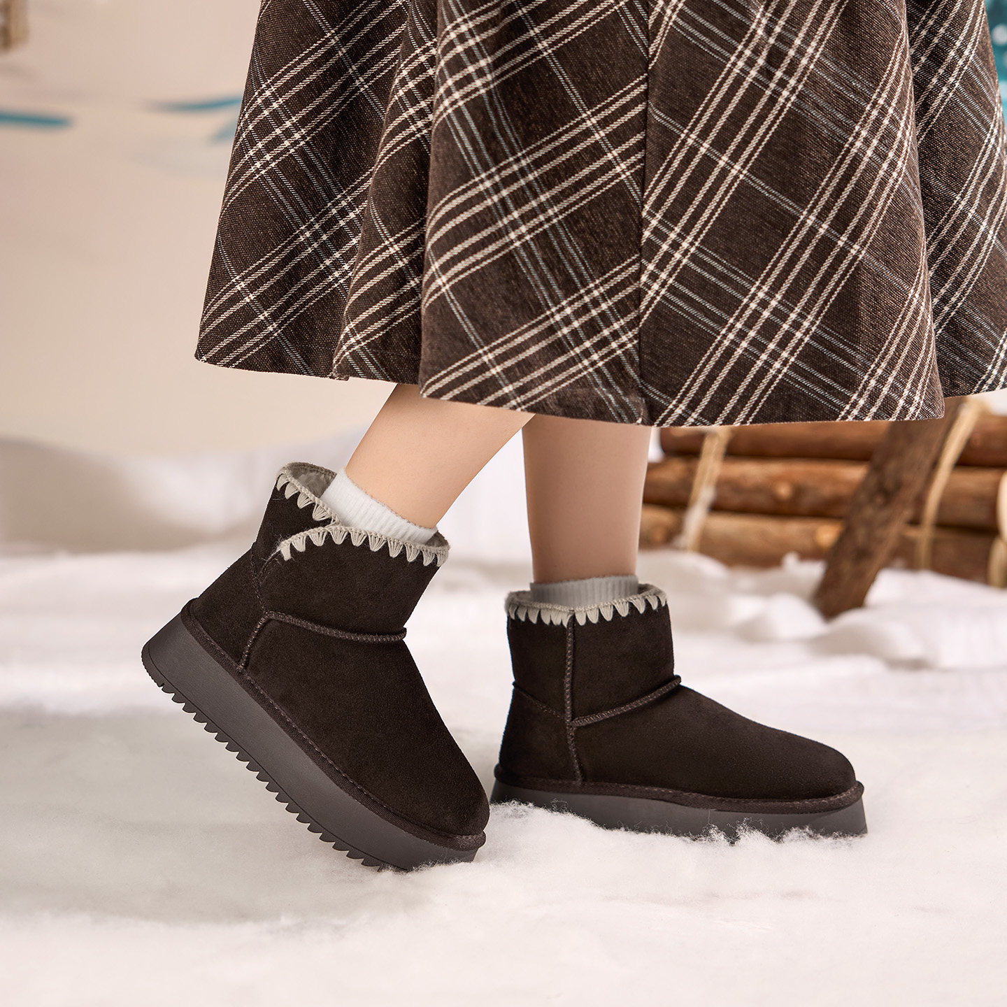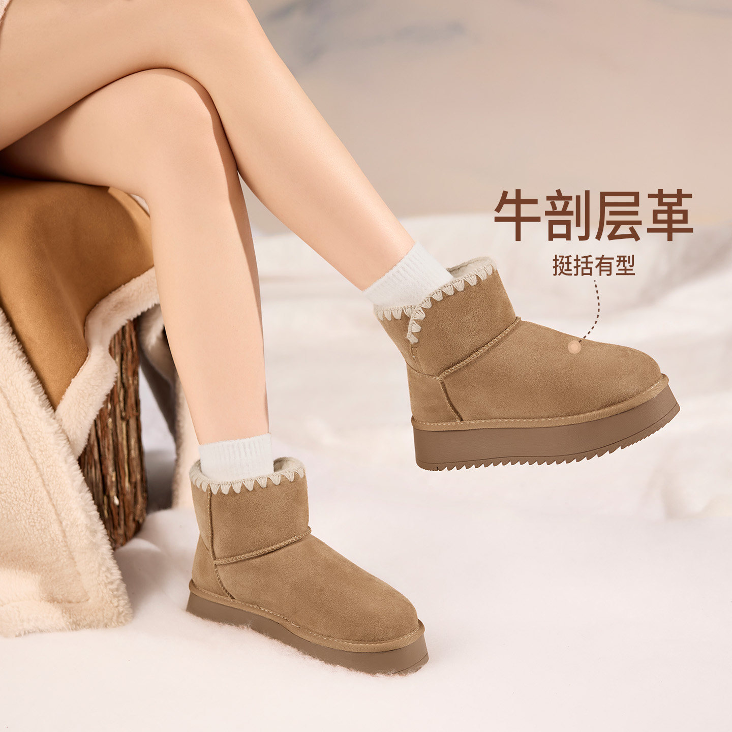 内增高~桑坡真皮厚底羊毛雪地靴女加绒保暖东北棉靴秋冬季短筒靴