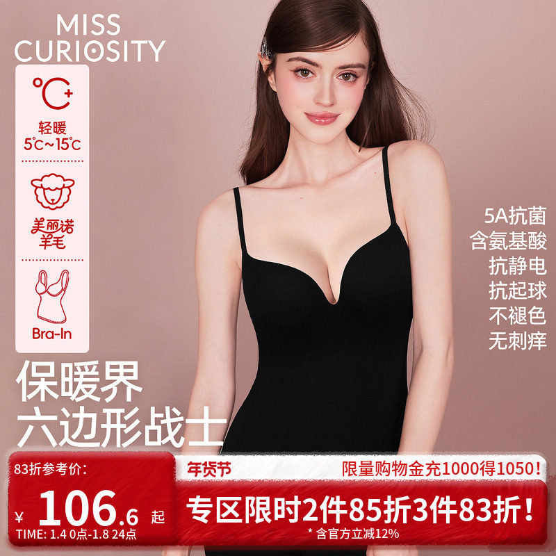 好奇蜜斯羊毛保暖背心吊带抗静电带胸垫秋衣打底衣肌底衣发热加绒