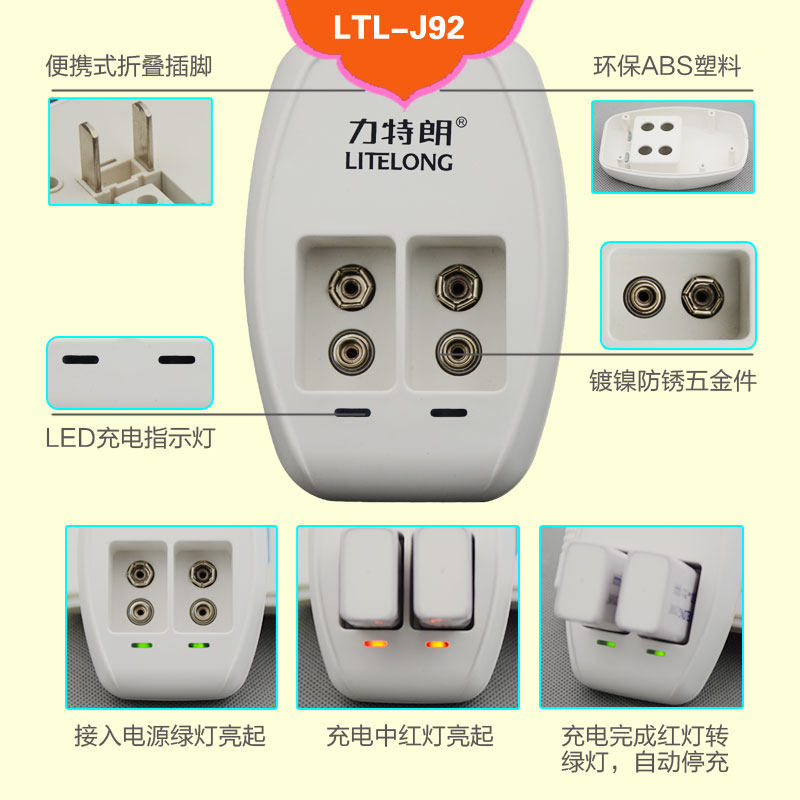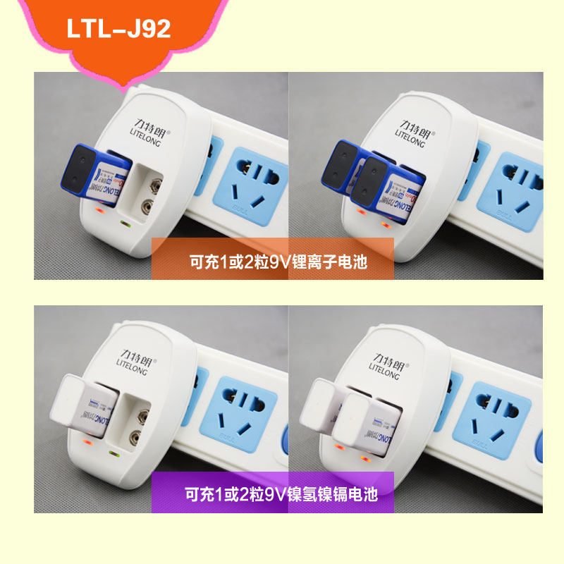 力特朗 9V电池充电器遥控器万用表通用型2槽智能极速充电器J92九伏镍氢镍镉锂离子电池通用极速充电器