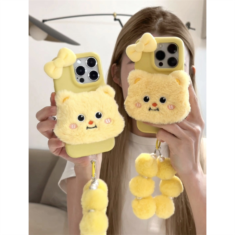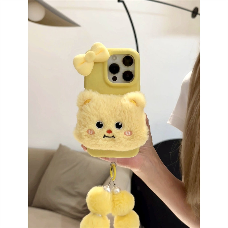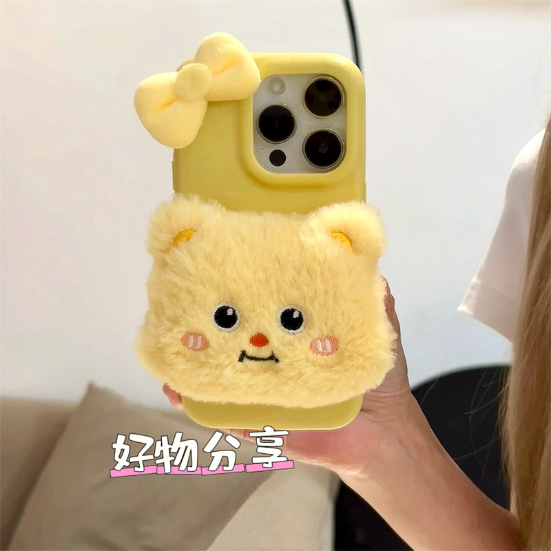 ins少女心卡通秋冬毛绒公仔黄油小熊适用苹果16promax手机壳新款14pro软硅胶iPhone13p防摔iPhone16全包挂绳