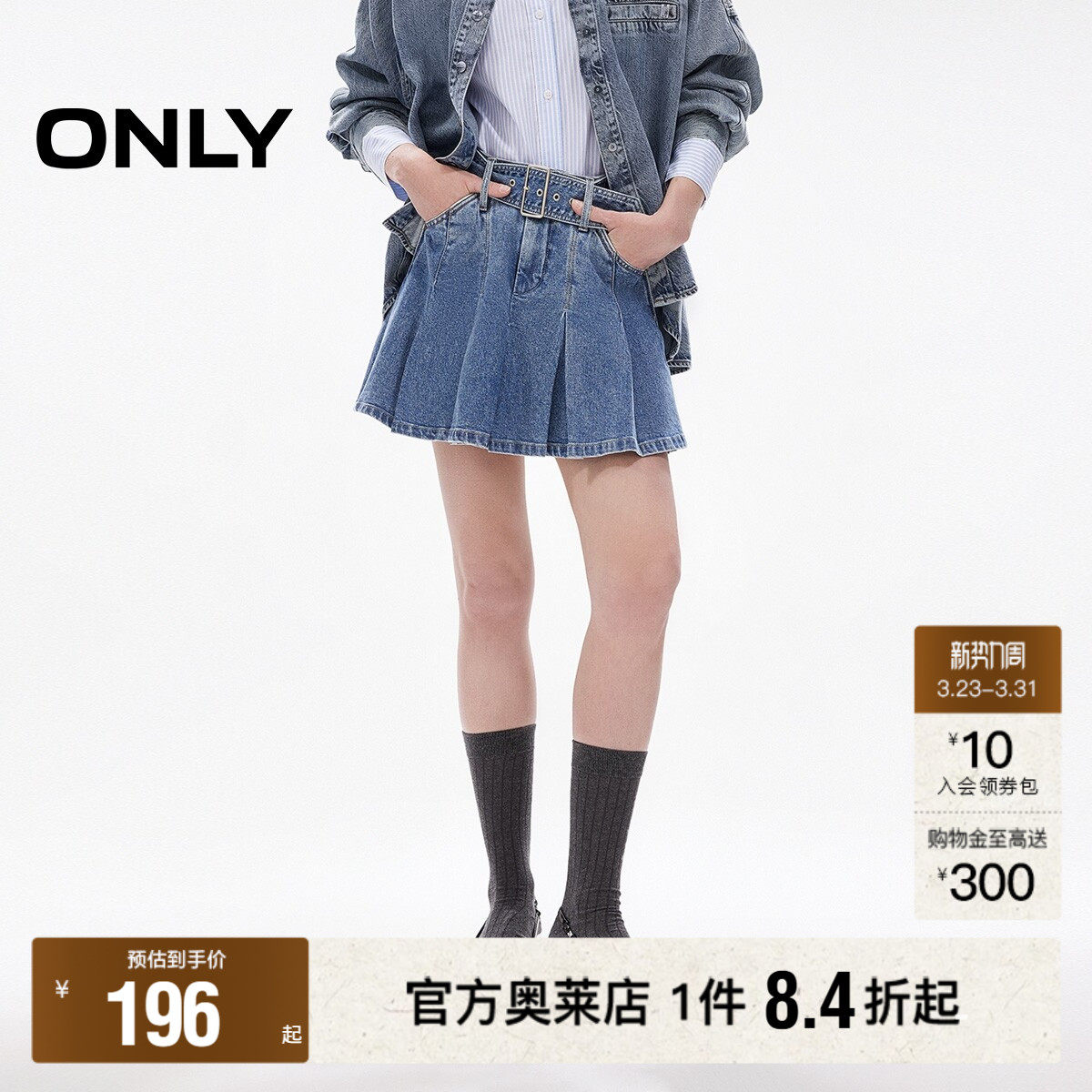 【ONLY奥莱】春款甜美减龄腰带装饰A字百褶高腰短裙牛仔半身裙女
