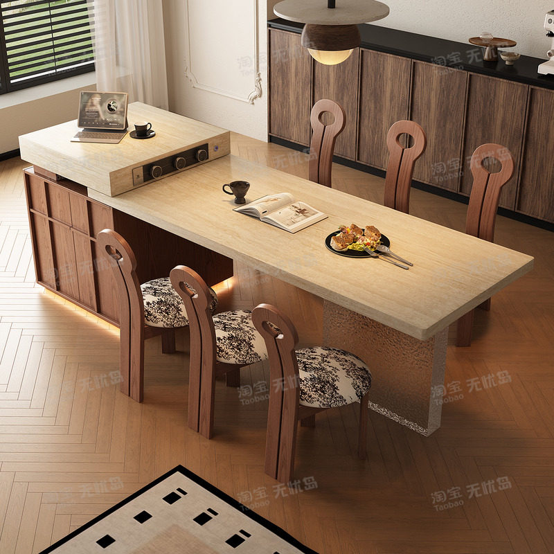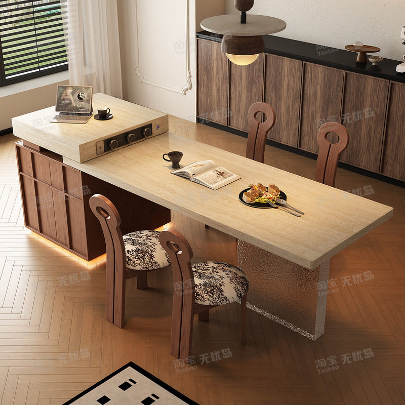 中古风岩板岛台餐桌一体式家用可定制伸缩倒台带电磁炉高级导台