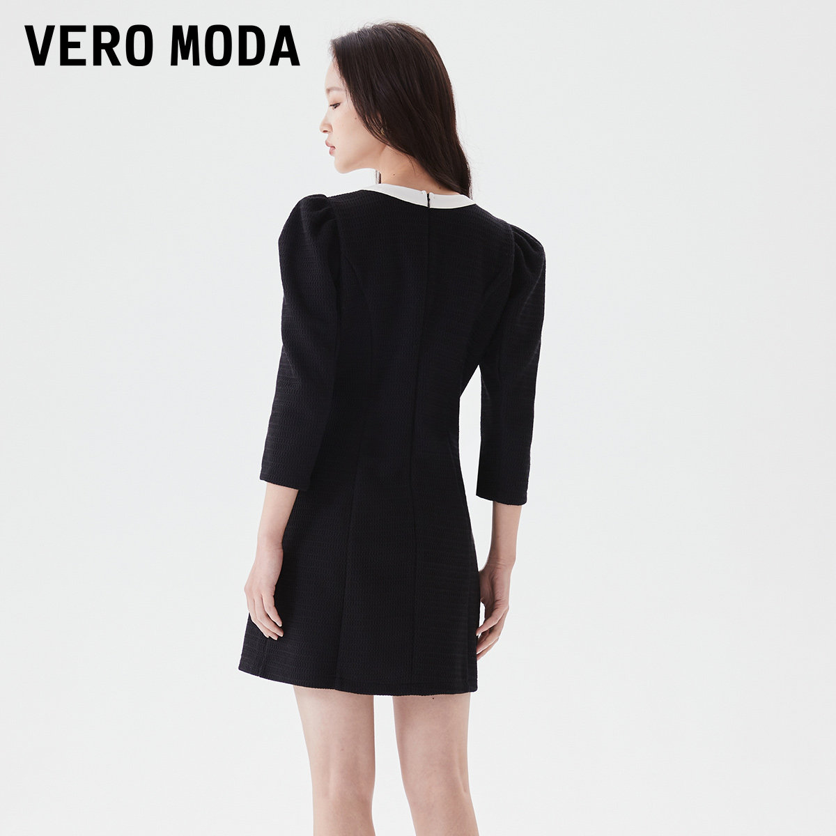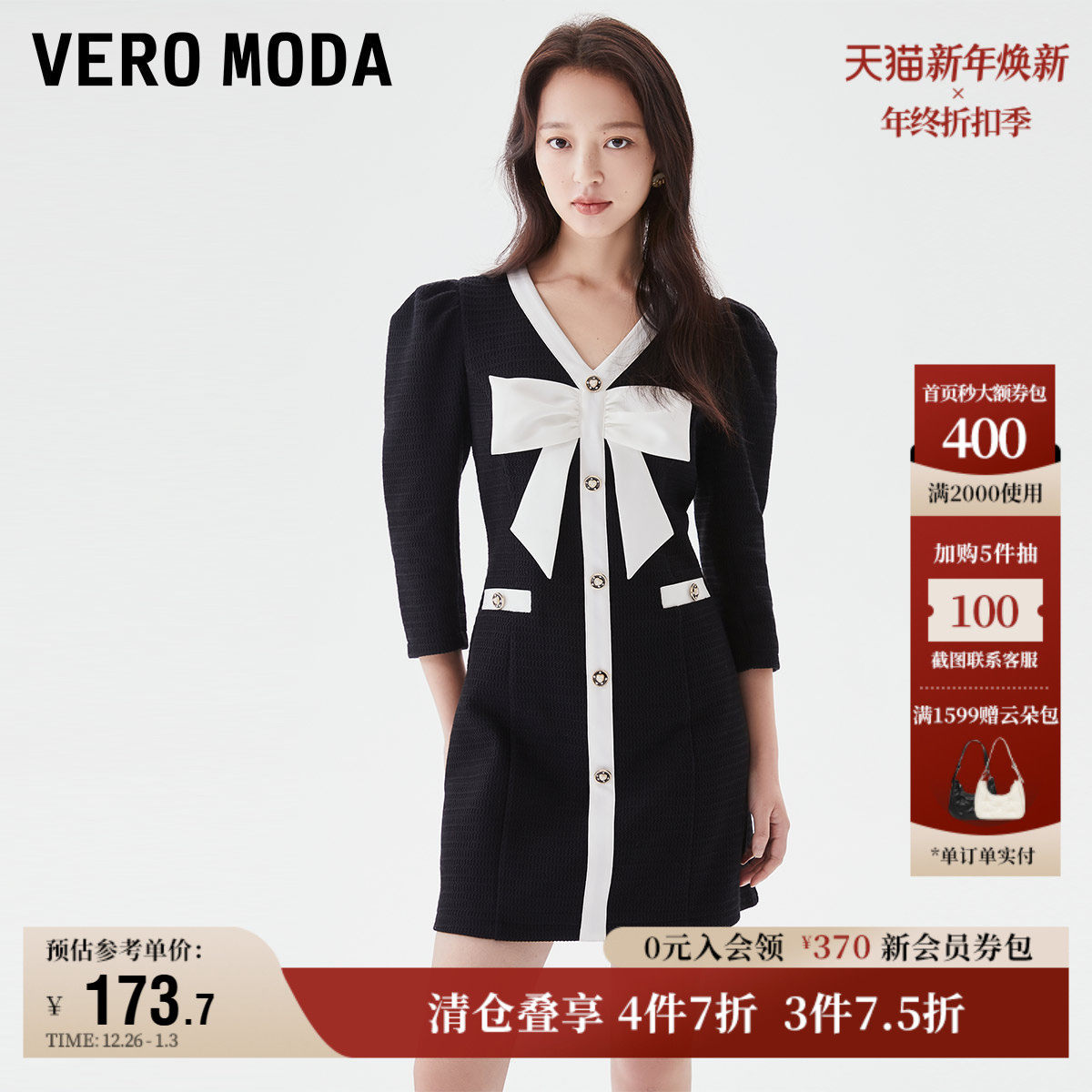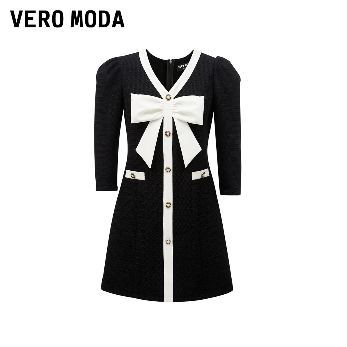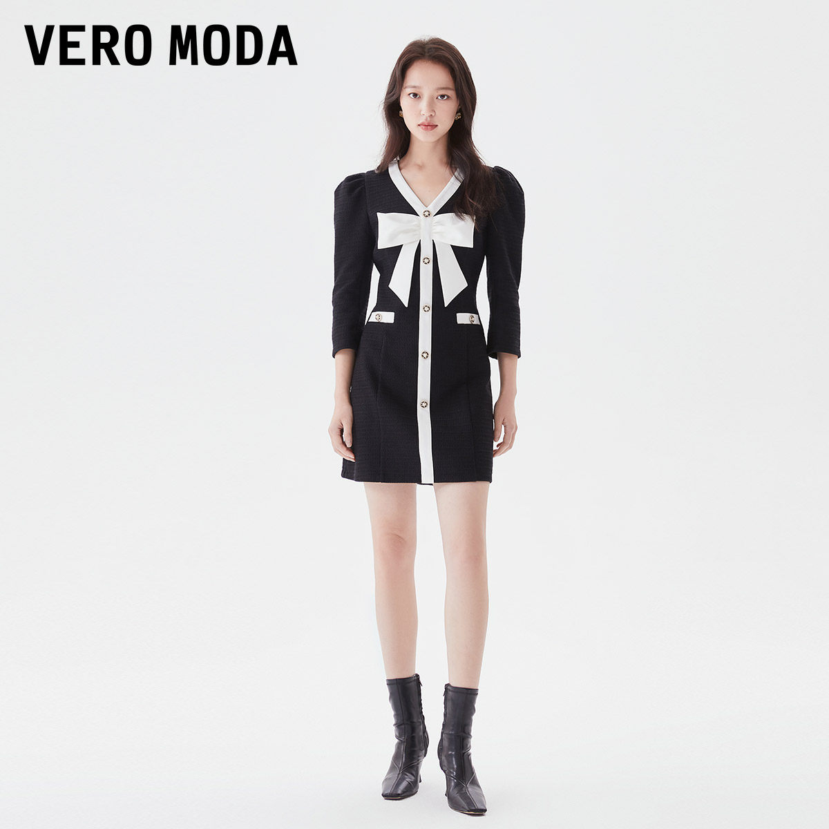 Vero Moda奥莱连衣裙秋季新款v领七分泡泡袖撞色蝴蝶结小香风流行