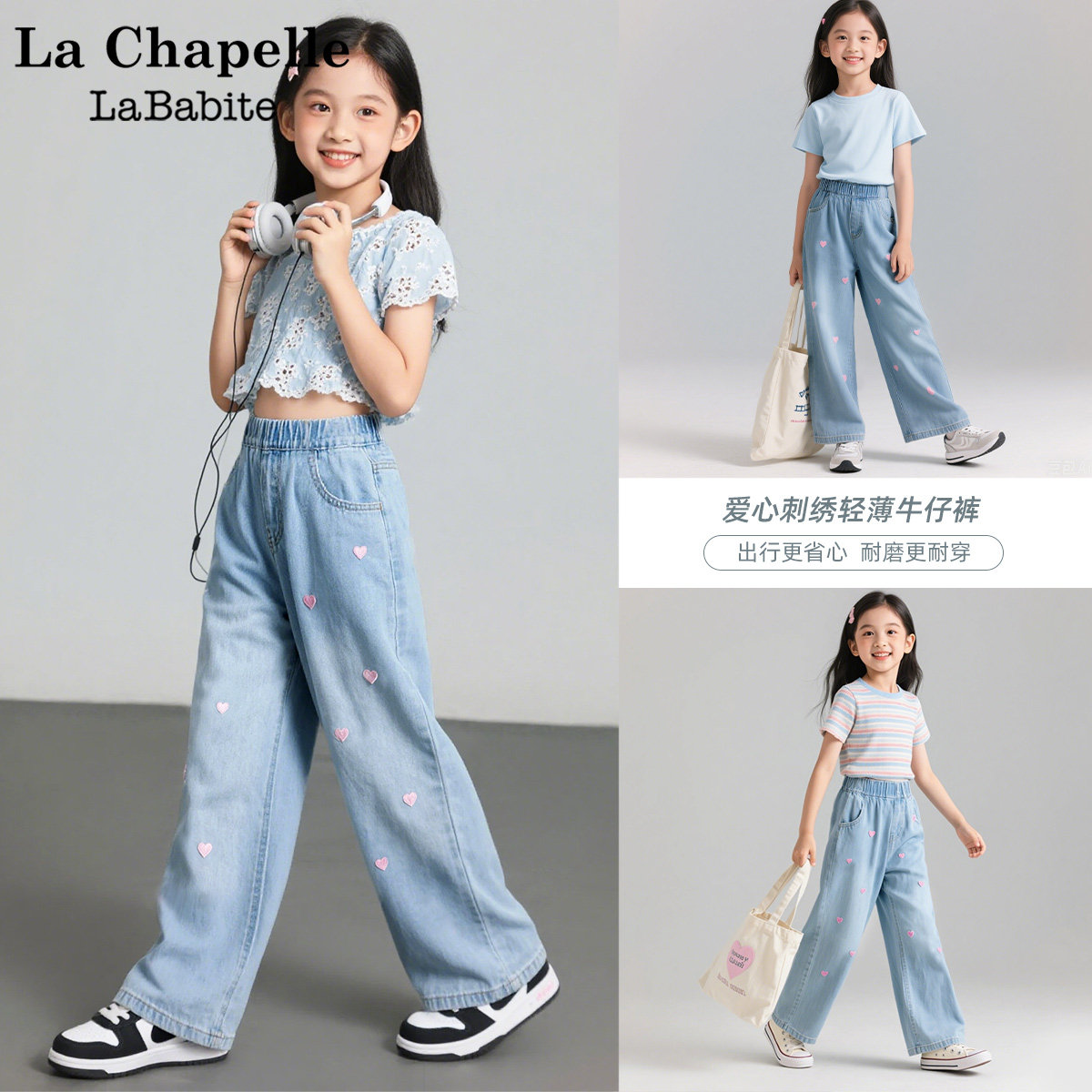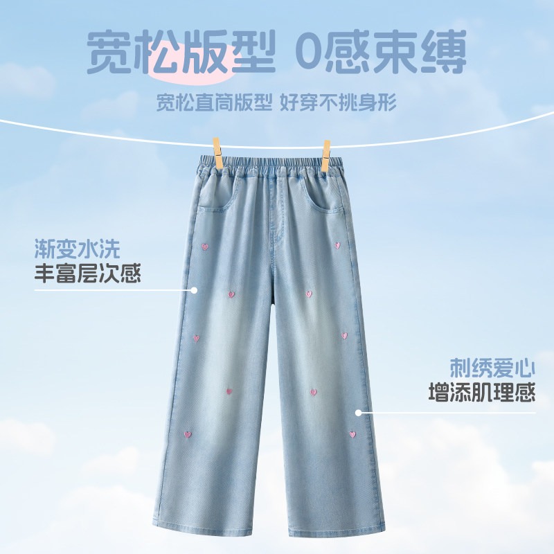 拉夏贝尔联名童装女童天丝牛仔裤夏薄款爱心刺绣裤子休闲儿童夏装