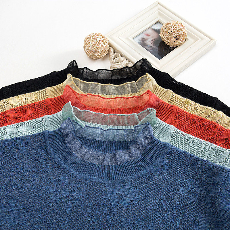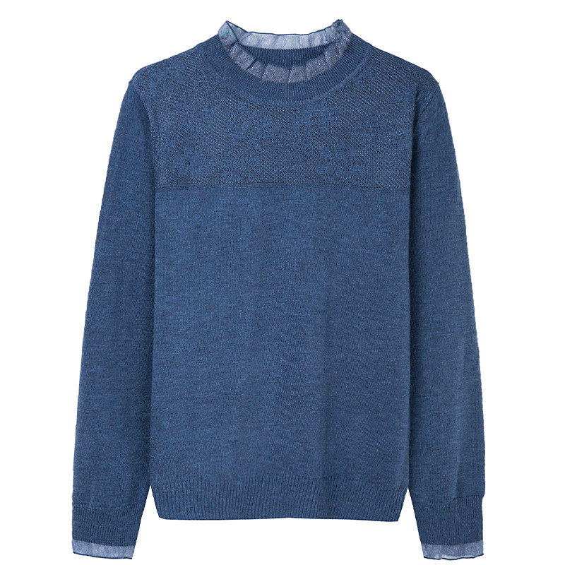 恒源祥雾霾蓝色羊毛上衣女薄毛衣套头镂空针织衫蕾丝春秋装打底衫