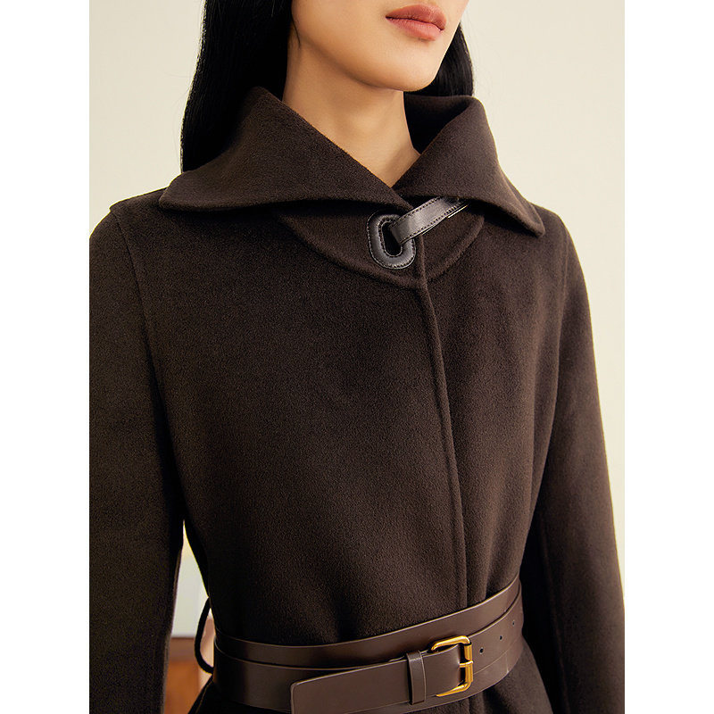 YINER音儿2025冬季新款法式羊毛羊绒混纺A摆系带交叠翻领长款大衣