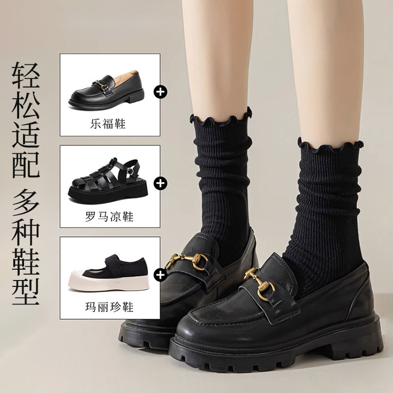 袜子女款秋冬防臭中筒袜棉袜木耳花边堆堆袜配乐福鞋长袜黑色吸汗