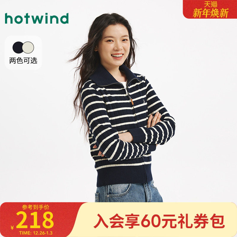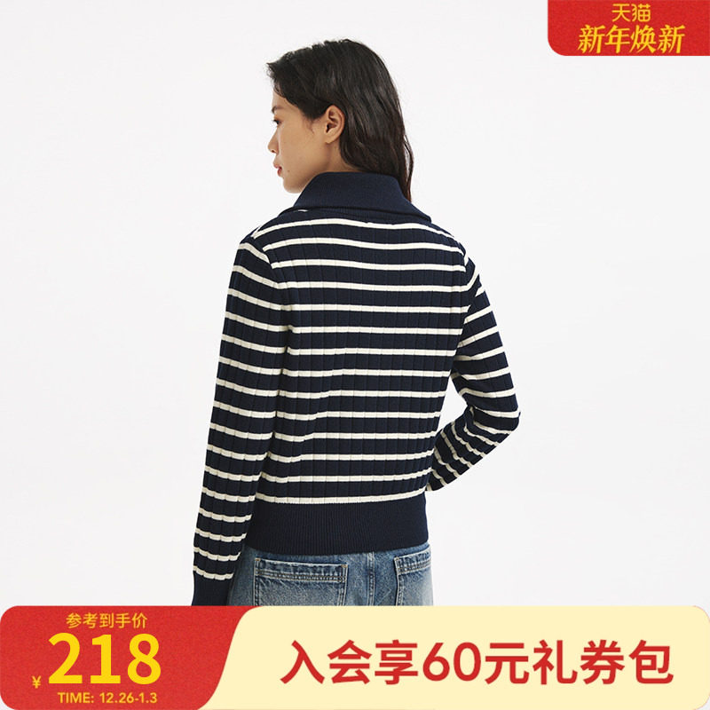 热风2025年秋季新款女士翻领松弛感学院风条纹POLO开衫经典简约