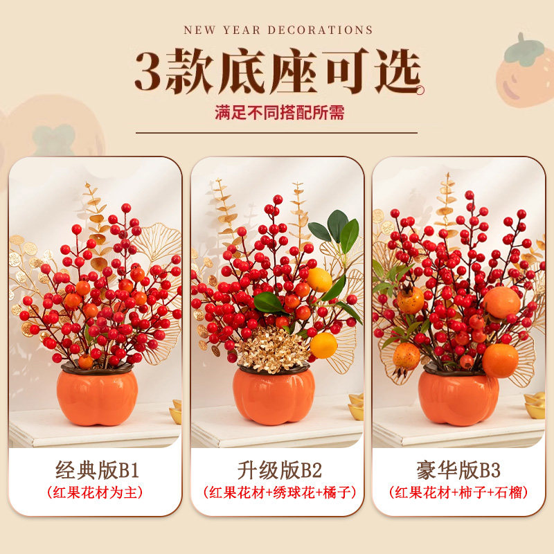 马年新年春节仿真花束红色柿子福桶手工摆件装饰品过年氛围布置