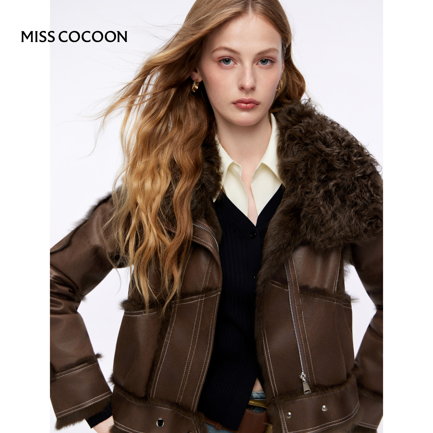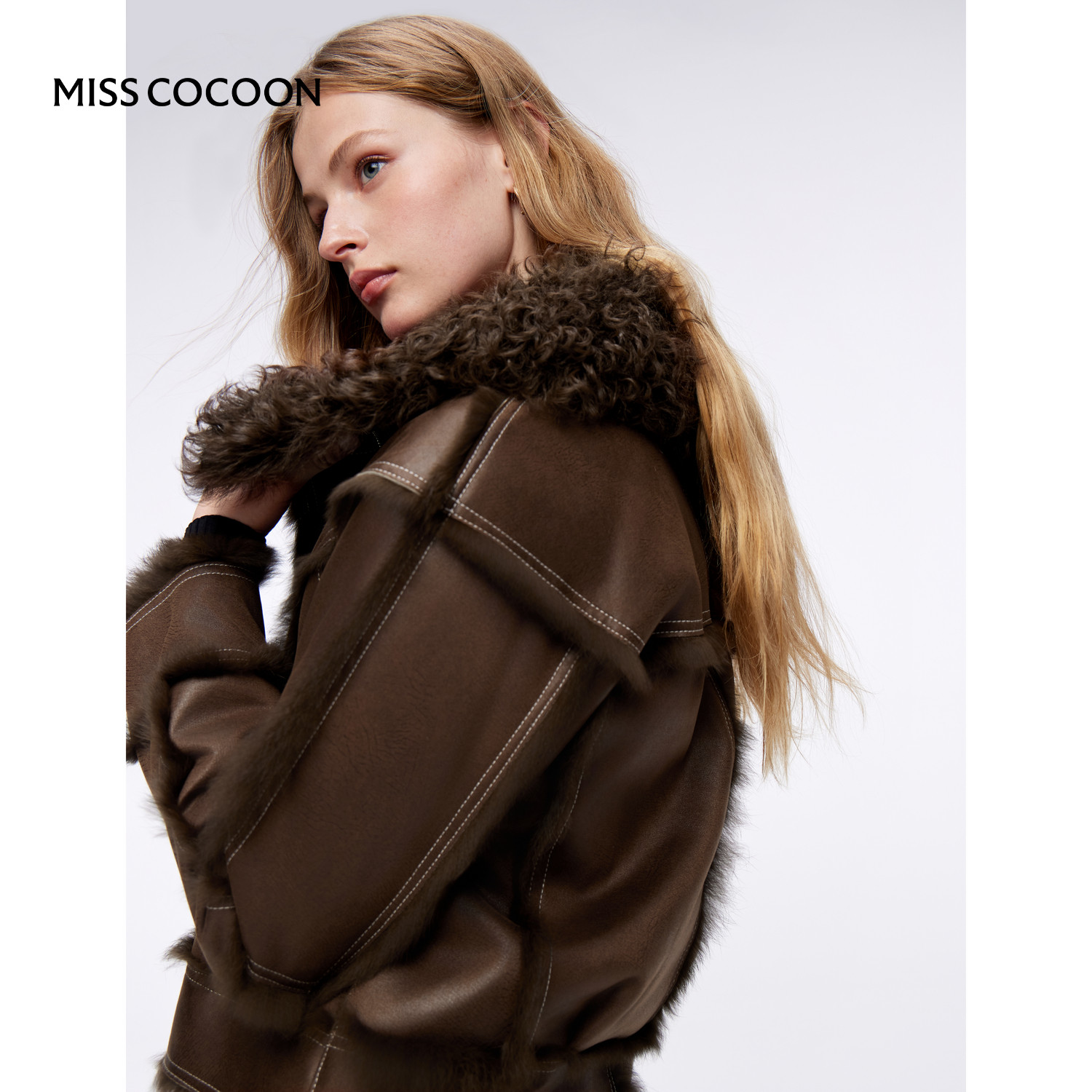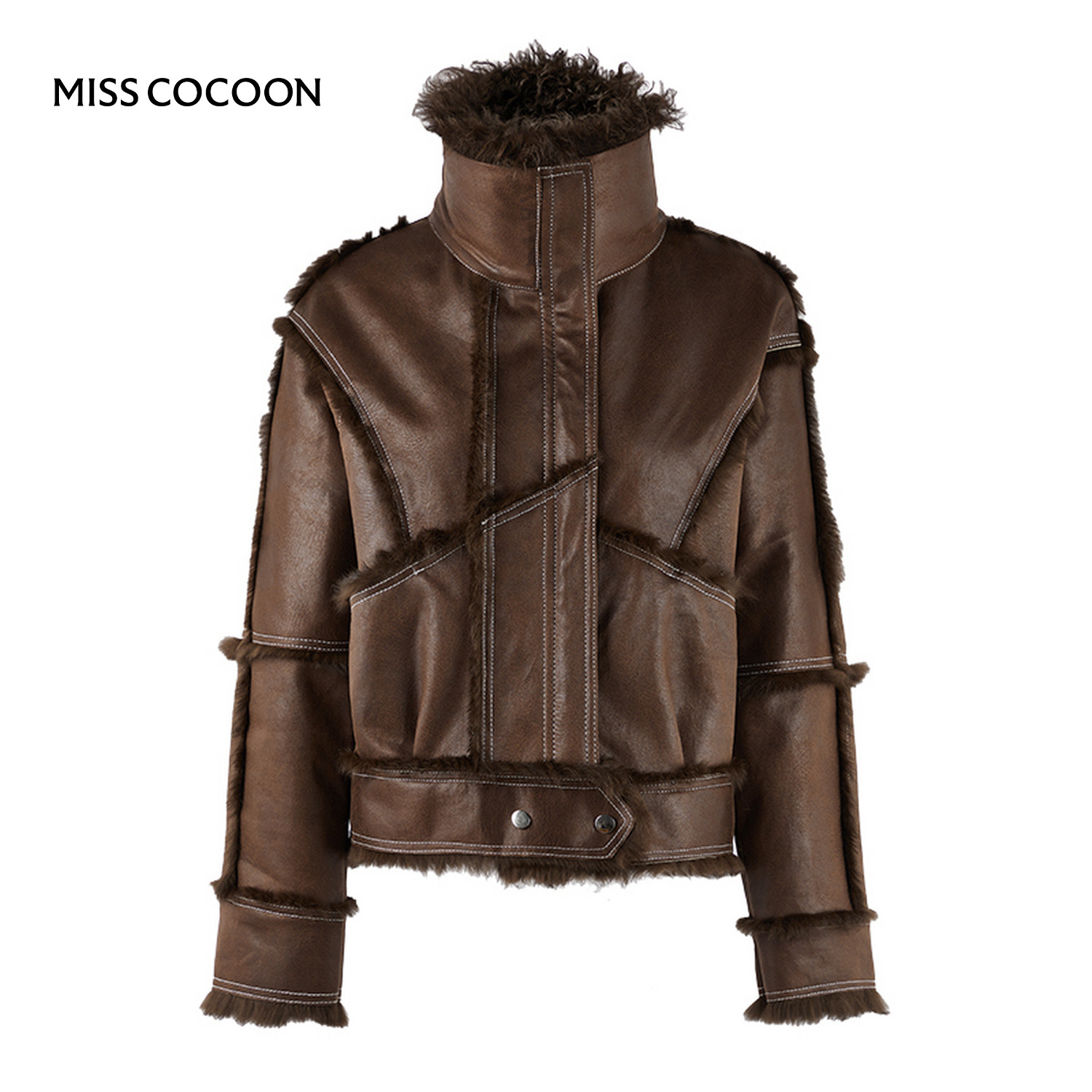 MISSCOCOON可可尼仿皮衣短款外套女2025秋冬新款棕色大翻领皮草