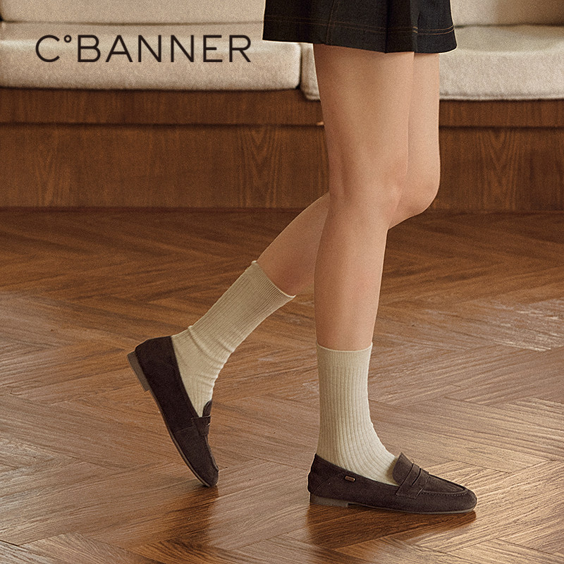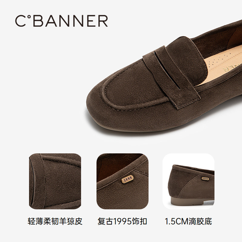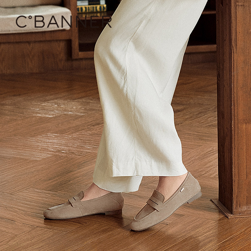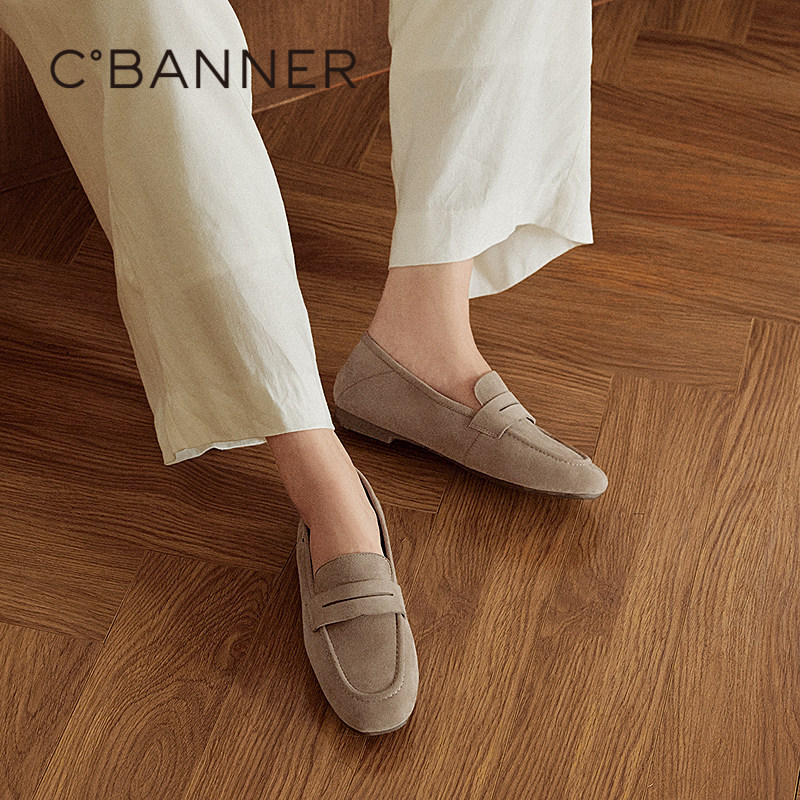 千百度平底低跟绒面乐福鞋豆豆鞋女2025秋季新款真皮通勤深口单鞋