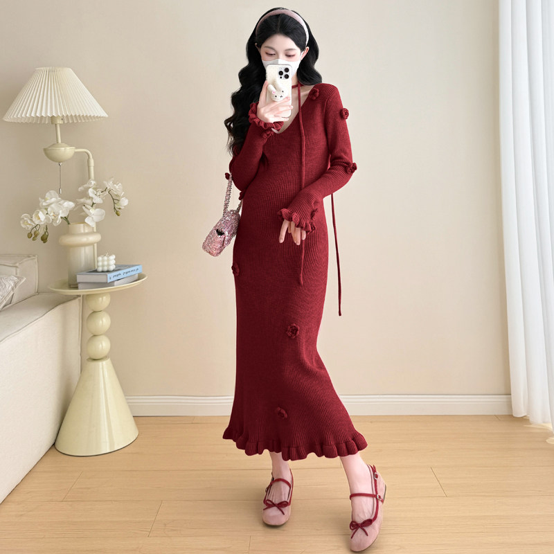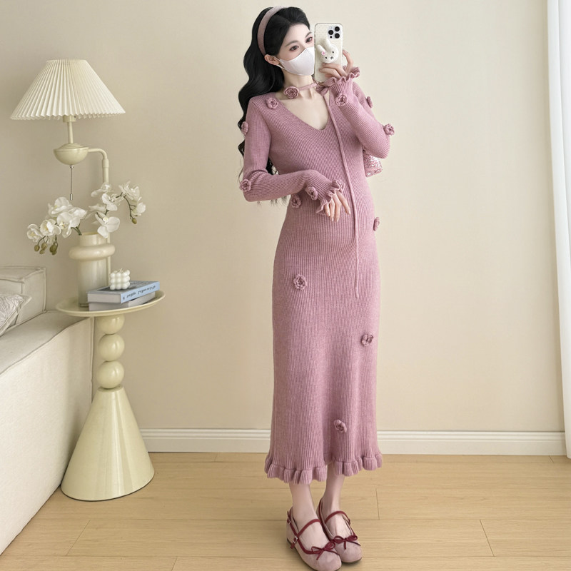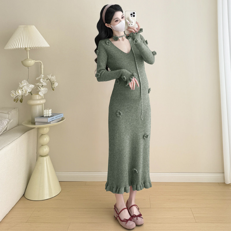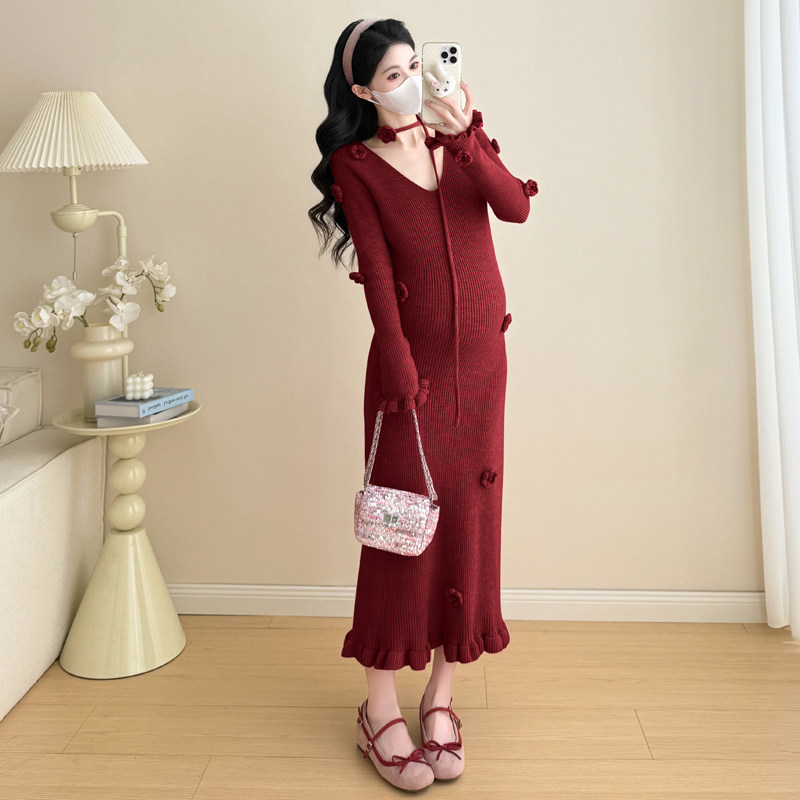 婧麒孕妇装连衣裙套装2025新款秋冬花朵宽松针织毛衣吊带长款裙子
